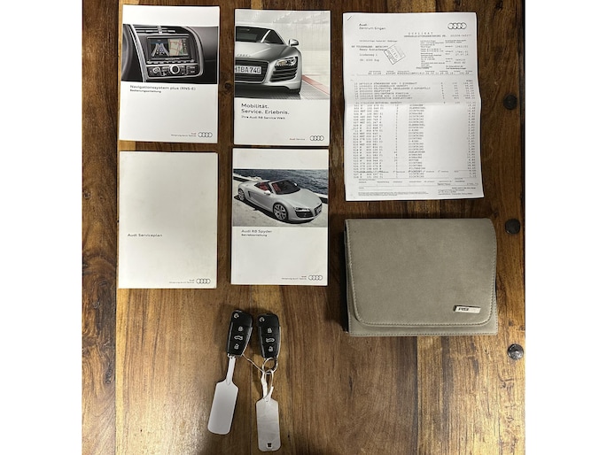 Deze Audi R8 Spyder 4.2 V8 met zijn handgeschakelde 6 versnellingsbak en keramische remmen begon zijn leven in Duitsland in 2011. Hier is hij Audi dealer onderhouden tot en met 2015. Begin 2015 is deze R8 in Duitsland gekocht door een Zwitserse liefhebber. In de garantie van de Duitse Audi dealer is er bij ca 93000 km een compleet nieuwe motor gemonteerd. Dus de nieuwe motor heeft nu ca 23000 km gereden, en de gehele auto 120000 km. Uiteraard is hiervan de rekening van de Duitse Audi dealer aanwezig van ruim €25500,-. (zie foto ) Daarna is deze R8 zijn leven verder gegaan in Zwitserland. In Zwitserland is hij onderhouden door een Lamborghini/R8 specialist. Nu anno 2026 is hij te bewonderen in onze showroom aan de Hoenderweg 15 te Ermelo
