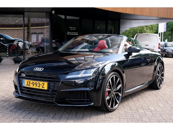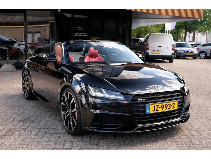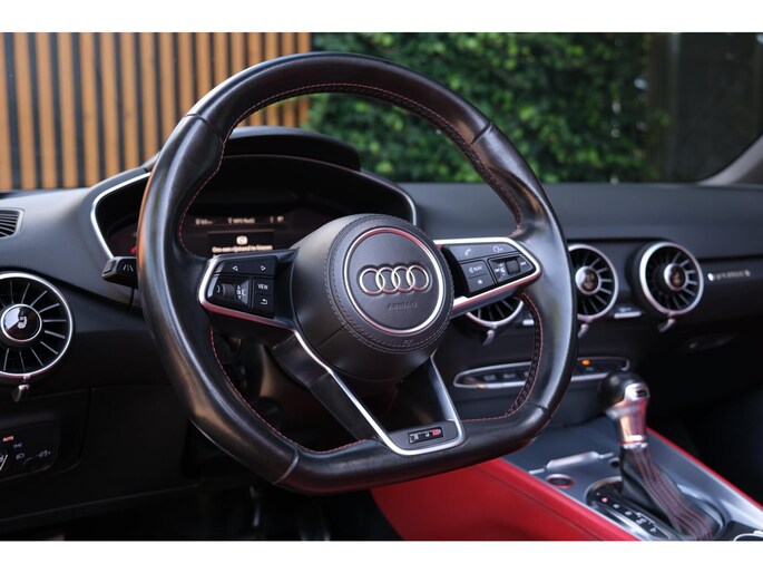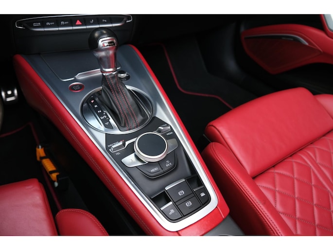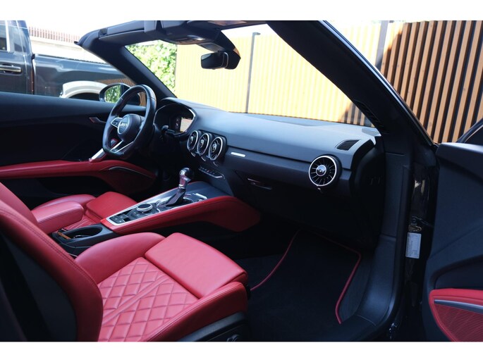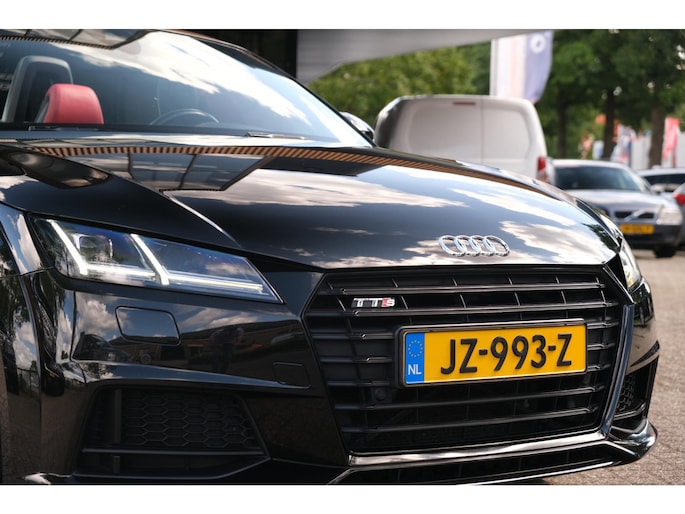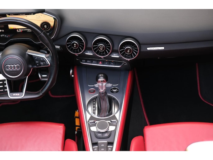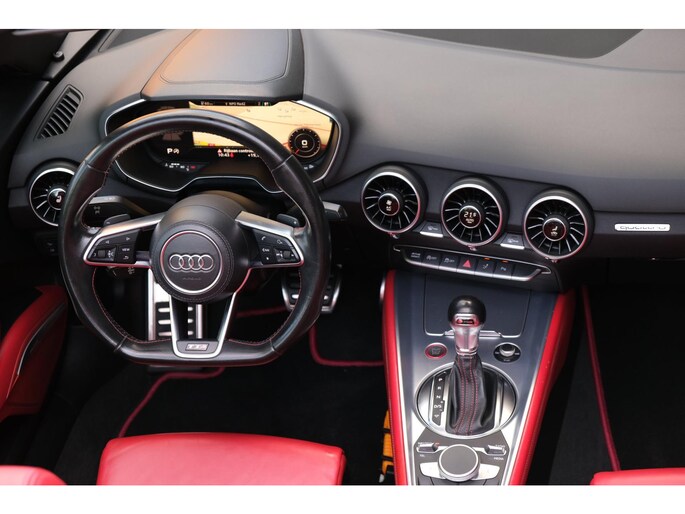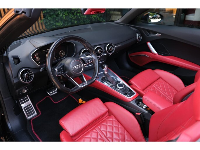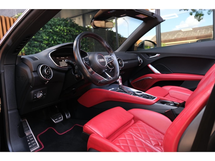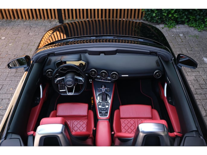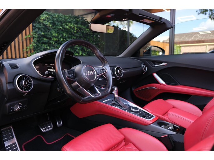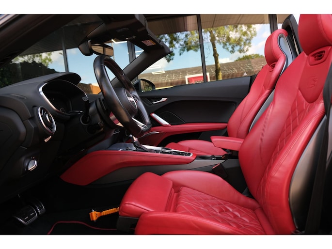 Nette, perfect onderhouden en rijk uitgeruste Audi TT Roadster 2.0 TFSI TTS quattro Pro Line + uit 2016. Deze 310pk sterke cabrio is o.a. voorzien van: softtop, nekverwarming, stoelverwarming, DAB, keyless, Bang & Olufsen Sound System, lane assist, elektrisch verstelbare voorstoel(en), LED koplampen en S-Line pakket. Uitgevoerd in zwart metallic met rood lederen sportinterieur.