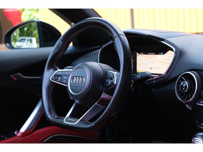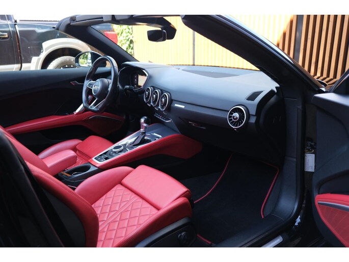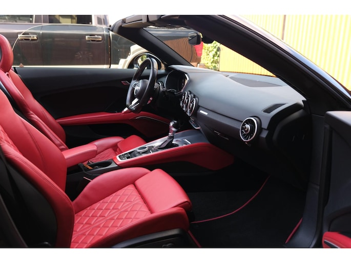 De Audi TT Roadster TTS quattro uit 2016 is een uitgesproken sportieve cabriolet die rijplezier en verfijning combineert in een krachtig en strak ontworpen totaalpakket. Met zijn zwart metallic carrosserie, softtop en opvallend rood lederen sportinterieur, straalt deze roadster exclusiviteit en dynamiek uit.