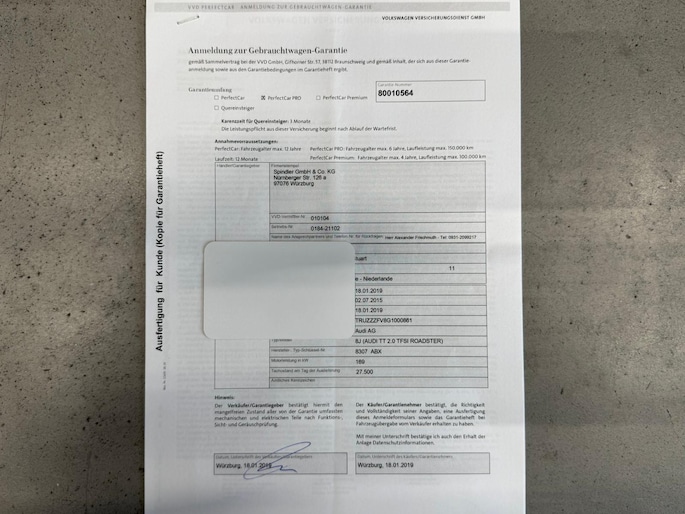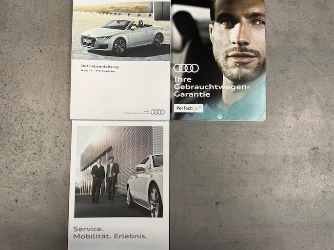Een van origine Duits geleverde Audi TT Roadster. Eerste in gebruikname juli 2015 door de eerste eigenaresse. Altijd Audi onderhouden gebleven. Eind 2018 werd de auto ingeruild voor wederom een Audi. Onze klant met eisen en oog voor detail kocht deze bijzondere TT Roadster bij Audi dealer Spindler GmbH & Co. KG te Würzburg. De auto had destijds 27500km gereden. De auto werd schadevrij verkocht en geïmporteerd. Van het begin van aankoop periode tot en met recenter , van alles is foto materiaal van deze TT aanwezig op een bijgevoegde stick. In begin 2019 stond de Audi op Nederlands kenteken. Later werd de auto tevens voorzien De liefhebberij bleef niet stil staan. Er werd hobbymatig mee gereden voor ruim 6 jaar! Van de gehele tijd zijn alle nota's present. Wij ruilden de auto in en verkochten deze aan één onzer vaste klanten. Na een relatief kort bezit ruilde hij de auto bij ons in op een Bmw Z4 type G29. Gunstig te weten: Vorig jaar heeft de auto nog Longlife service ondergaan bij Audi Rotterdam op 78958. Tevens staat de auto op vier zo goed als nieuwe banden van het merk Michelin. Wordt u geheel rijklaar aangeboden inclusief huisgarantie. Desgewenst is *Autotrust garantie mogelijk tegen meerprijs.