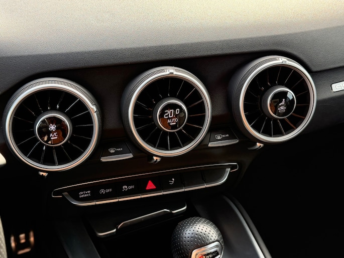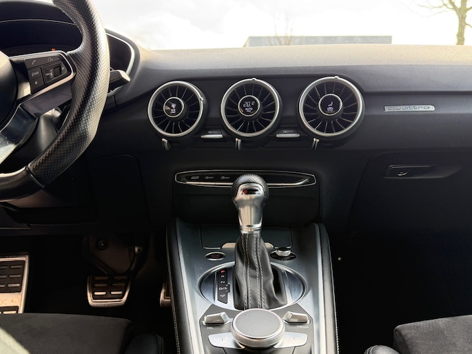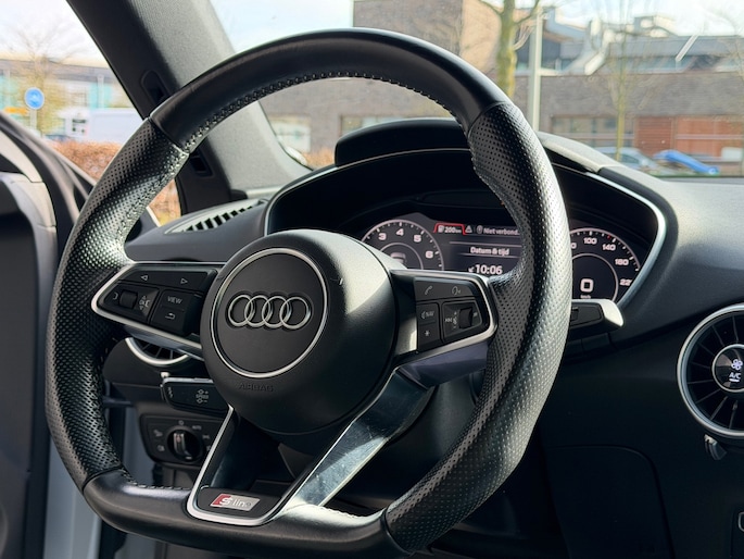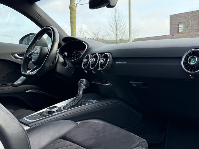 Het high performance audiosysteem staat garant voor een levendige en krachtige muziekweergave. Met automatische airconditioning hoeft u alleen de gewenste temperatuur in te stellen. Het systeem doet de rest. U kunt bij het inparkeren natuurlijk niet aan alle kanten ogen hebben. Daarom is deze Audi TT voorzien van parkeersensoren! De automatisch inschakelbare verlichting en regensensor zorgen dat onderweg automatisch de verlichting en de ruitenwissers worden ingeschakeld. Daarmee nemen ze u veel werk uit handen. Voor de lange ritten is de cruise control een verademing. Ook navigatiesysteem met harde schijf, lederen sportstuur, DAB ontvangst en automatisch dimmende buitenspiegels zijn aan boord.