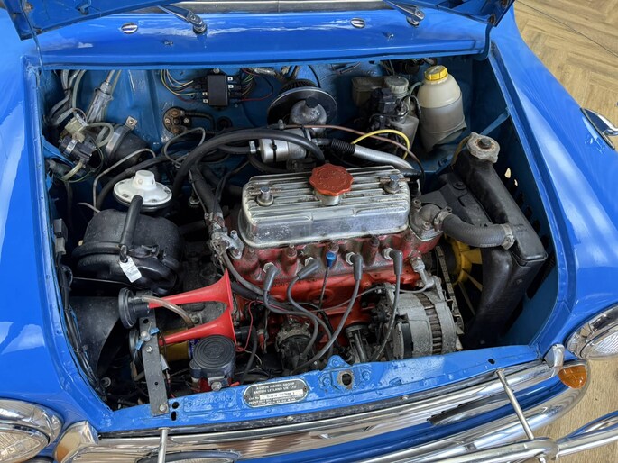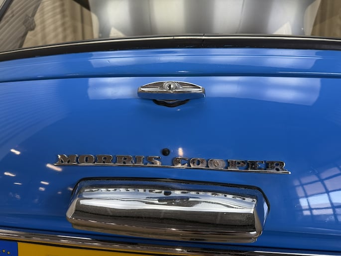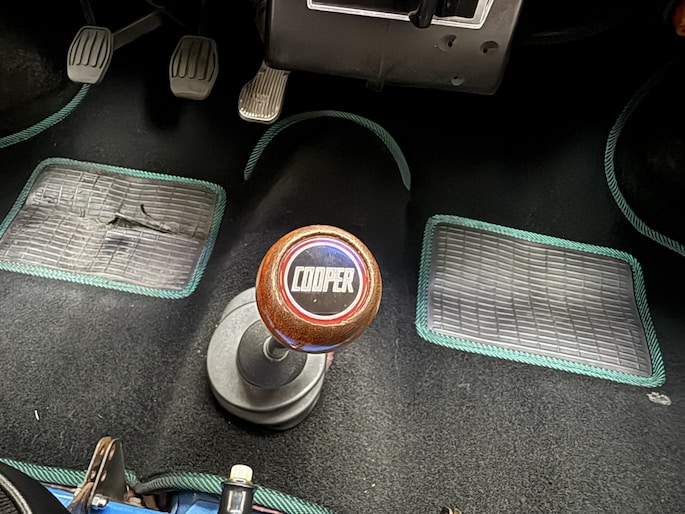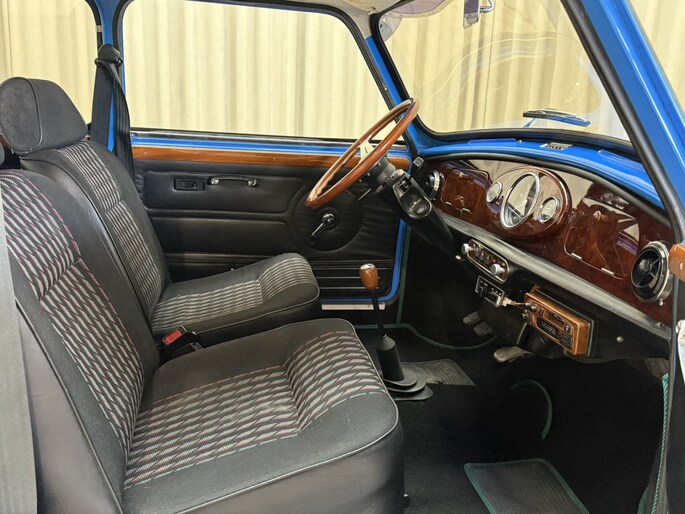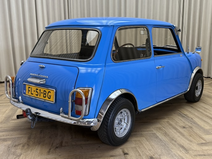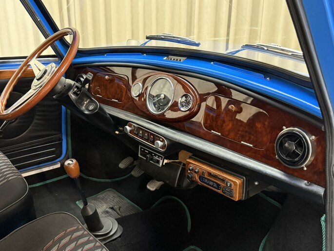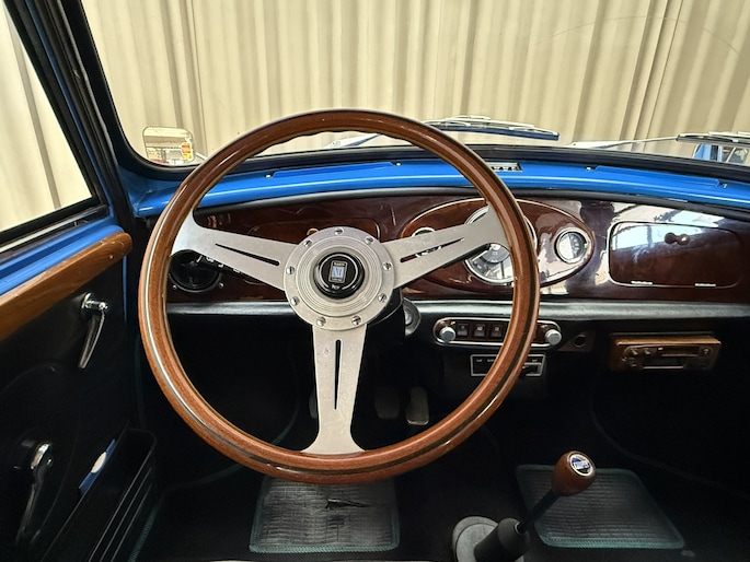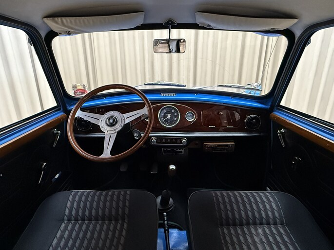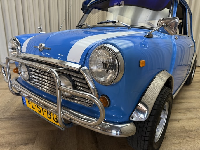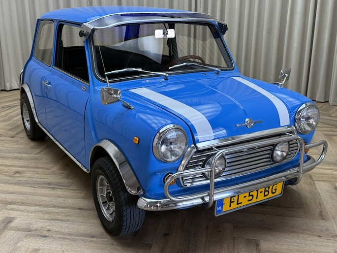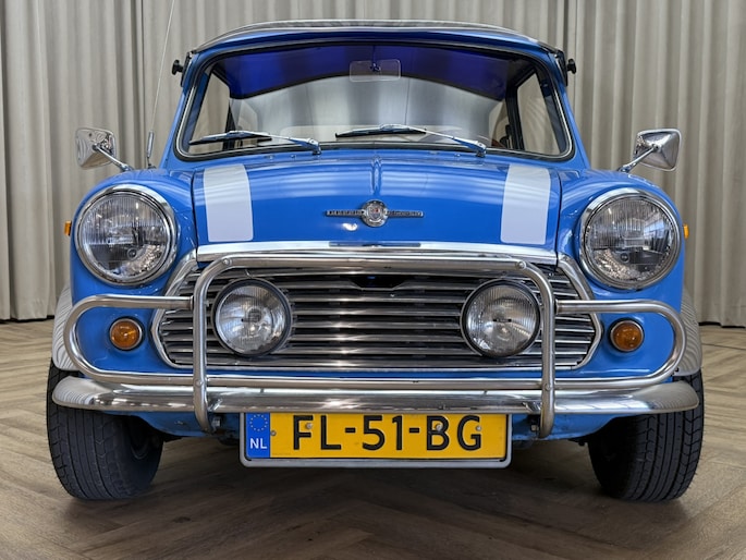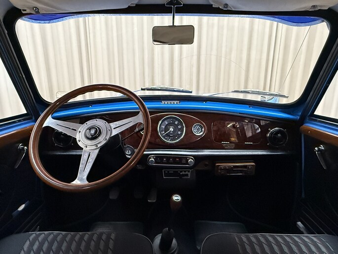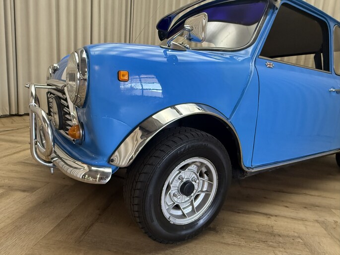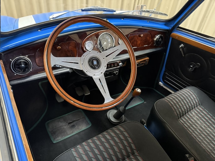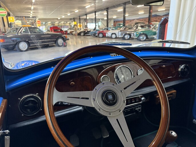 Wat deze Mini vooral bijzonder maakt zijn de diverse accessoires, zoals de zonneklep, bullbars voor & achter, mistlampen, houten Nardi stuurwiel en Cooper pookknop, etc.