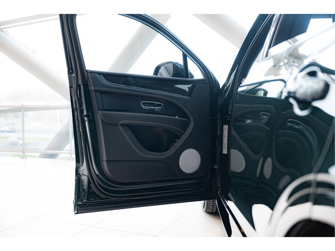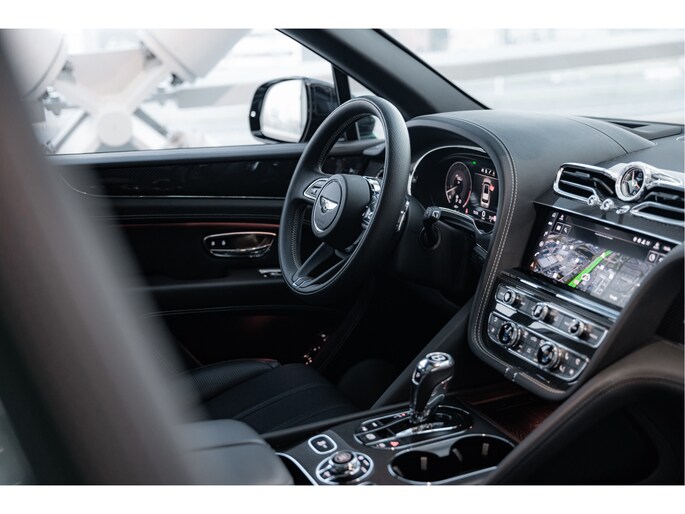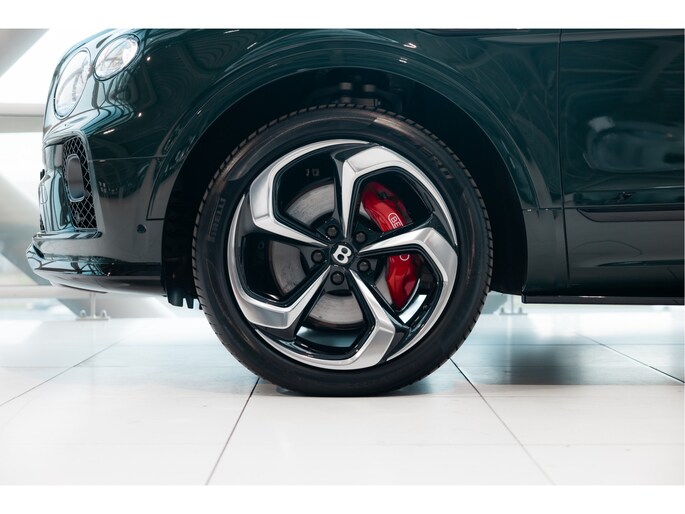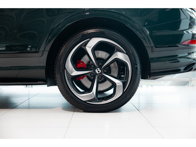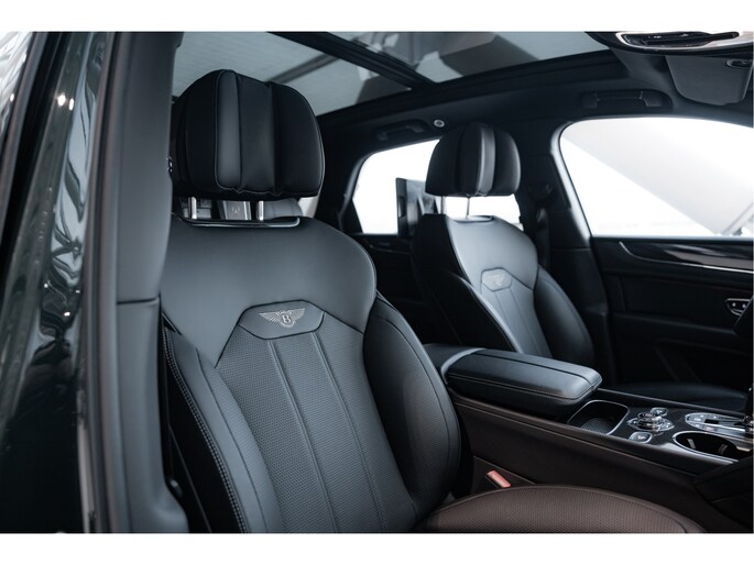 Deze Bentayga V8 S is uitgevoerd in de schitterende kleur Barnato, een diepe, luxueuze groene tint die de verfijning van het merk perfect weerspiegelt. Voorheen heete deze kleur Racing Green, maar de huidige naam is een eerbetoon aan Woolf Bernato, één van de befaamde Bentley Boys. De carrosserie straalt kracht uit, met zijn fraaie lijnen en een imposante grille die de aanwezigheid van deze Bentley onderstreept. Het sportieve karakter van de V8 S wordt verder versterkt door de fraaie 22 inch velgen met daarachter de rode remklauwen, de sportuitlaat, de achterspoiler en side-skirts.