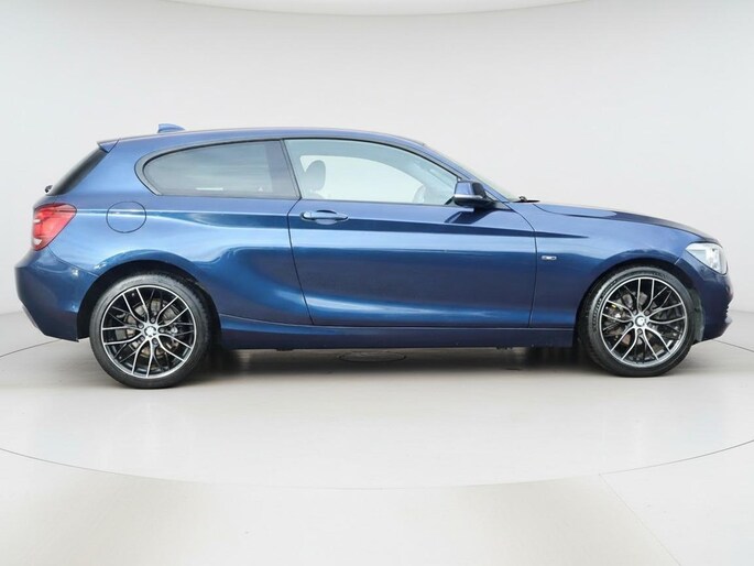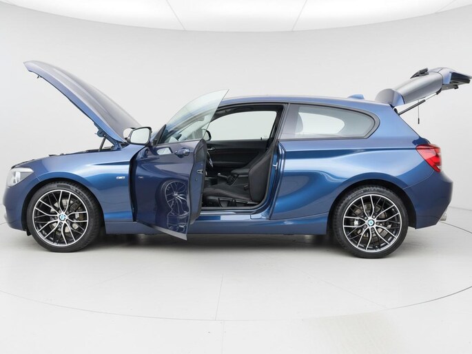 Uitgevoerd in de kleur Tiefseeblau metallic valt deze 1-serie direct op door zijn stijlvolle en tijdloze ontwerp. De strakke lijnen, herkenbare BMW-grille en sportieve lichtmetalen velgen geven de auto een krachtige en moderne uitstraling.