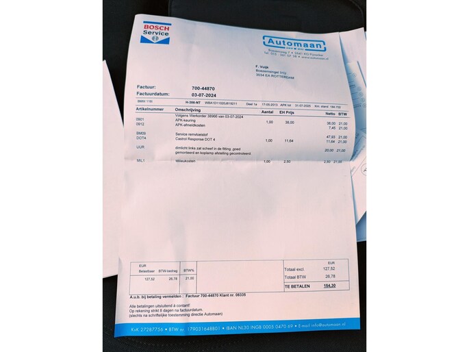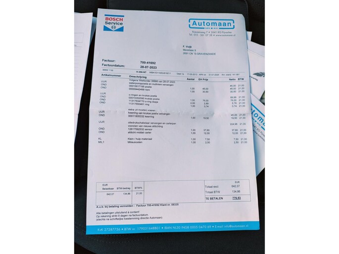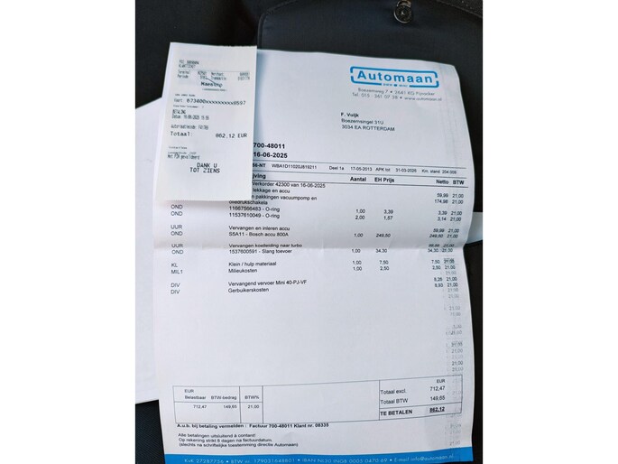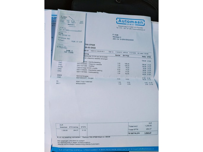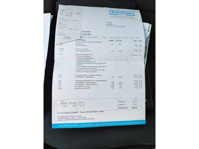 In 2022 is er een nieuwe distributieketting geplaatst. Zijn de kleppendeksel pakking en carterpakking vervangen. Verder is er vervangen: waterhuis achter cilinderkop. oliedrukschakelaar en carterpan, oliepomp cassette. En zijn de per 02-04-205 nieuwe banden en groot onderhoud gehad, incl. bougies en bobines. per 16-06-2025 nieuwe accu en vervangen koelleiding naar de turbo en pakkingen naar vacuumpomp. (facturen aanwezig)