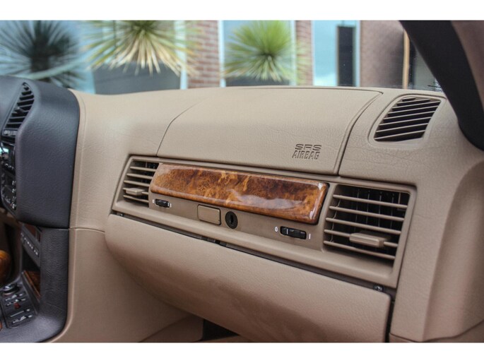 Van binnen een beig lederen sport interieur onderbroken met een hout dashboard inleg.