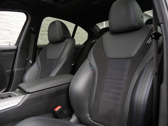 De sportstoelen zitten als gegoten, zijn meervoudig verstelbaar, voorzien van stoelverwarming en uitgevoerd in half leder/ alcantara met blauwe stiksels.