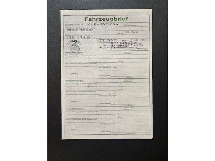 The car is absolutely rust- and accident-free, and remains largely in its factory-original paint. Only the right rear door was resprayed in the past. In addition, due to minor paint damage near the fuel cap, we had the right rear quarter panel professionally refinished. The interior is virtually flawless, clearly reflecting the careful use by its first owner. The service booklet is present but unstamped, as Mr. Verhoeven was a mechanic himself and carried out all maintenance regularly on his own. Several documents confirm the mileage.