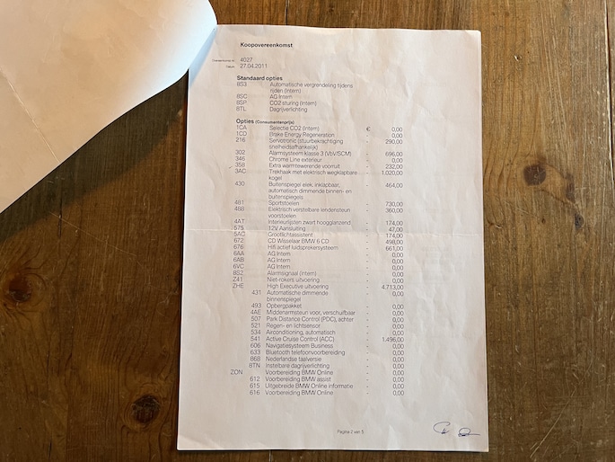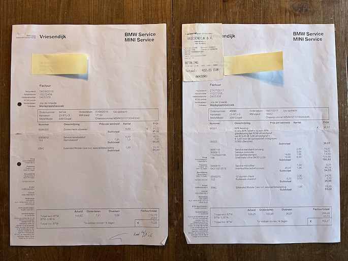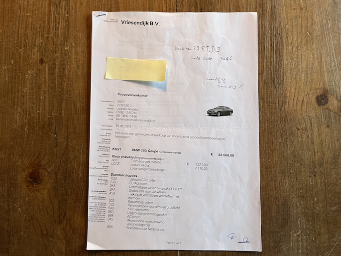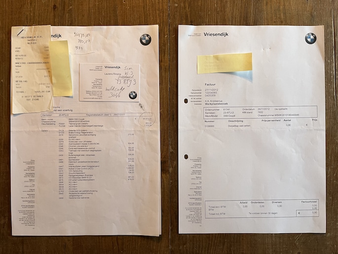 Er zijn auto’s – en er zijn auto’s met een verhaal. Deze BMW 330i Coupé is zonder twijfel van de tweede categorie. In juli 2011 nieuw geleverd aan de vader van de vorige eigenaar, die hem jarenlang met zorg en liefde bereden heeft. In 2021 kreeg zijn zoon de sleutels overhandigd, bij een kilometerstand van slechts ca. 21.000 km. Een oude kenteken deel 2 inclusief originele groen papiertjes met de tenaamstellen. En ook toen de zoon de auto ontving is het gedocumenteerd... Het bonnetje van die overdracht? Nog altijd aanwezig. Net als de originele aankoopfactuur, de accessoirebrochures, alle onderhoudsfacturen én zelfs de originele BMW folders van destijds. Een sluitende historie zoals je die zelden ziet.
