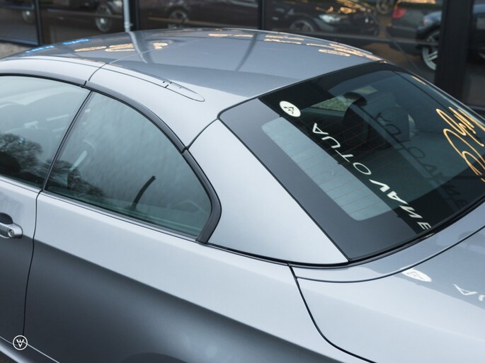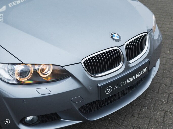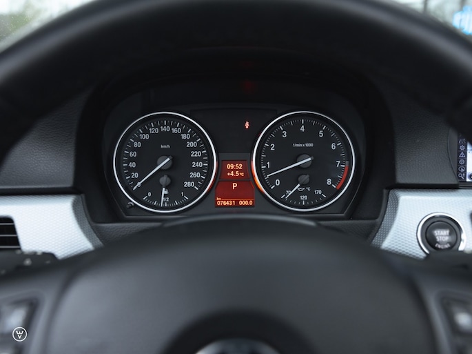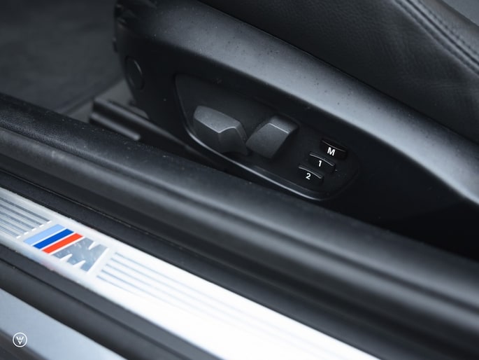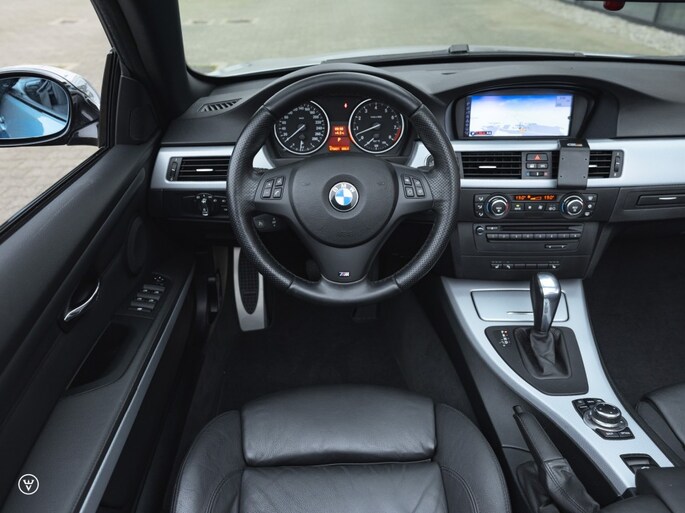 UITVOERING, HISTORIE, CONDITIE E93 perfectie vertegenwoordigt deze tot in de puntjes vertroetelde 325i M-sport. De kleurcombinatie: historisch correct in middengrijs metallic over zwart leer op de Sportstoelen, de afwerking buitenom uiteraard in het Shadowline-zwart – binnenin aluminium met een klein werkje. Goede wijn behoeft geen krans moet de eerste eigenaar gedacht hebben, waarbij hij zich één goed gemikte en rake uitspatting veroorloofde: de grootste en meteen ook mooiste wieloptie die destijds in de folder stond.