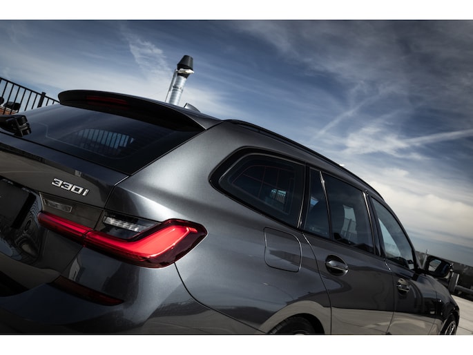 Het front van de BMW oogt agressief met het M Sport Aerodynamica pakket, de hoogglans zwarte delen van het Shadow Line pakket en de priemende LED koplampen. Wanneer deze 3-serie in je binnenspiegel opdoemt ga je zeker een baan naar rechts om vervolgens tegen de imposante achterzijde aan te kijken. Want ook hier straalt alles potentie uit door het M pakket en de uitlaten aan weerszijden. Geen overbodige opsmuk want dit is de 330i met verlaagd M-Technic onderstel. Geen hybride, maar een volbloed benzine turbomotor met standaard maar liefst 258pk. Goed voor een begrensde topsnelheid van 250 km/h en een acceleratietijd vanuit stilstand naar 100 km/h in slechts 6,0 seconden. Dit exemplaar is echter Stage I getuned door een zeer bekend en bedrijf. Hierdoor is het vermogen gestegen naar En zoals het een echte BMW betaamt aangedreven op sec de achterwielen. Allemaal ingrediënten voor een echte rijdersauto met de praktische eigenschappen voor het hele gezin.