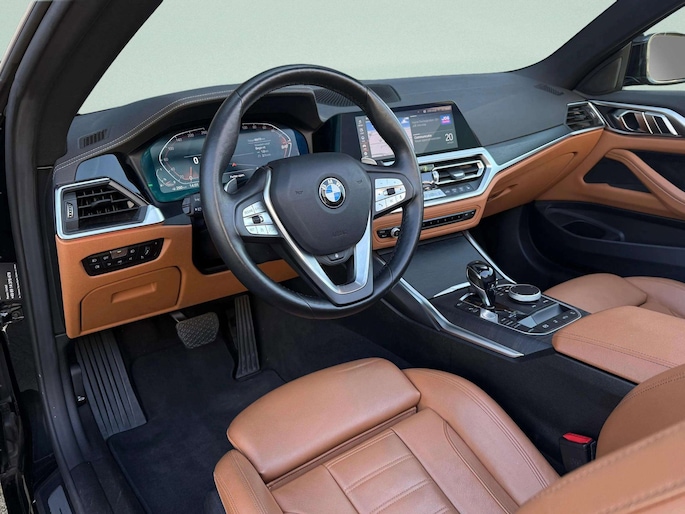 Stap in en ervaar wat écht premium cabriorijden is. Deze BMW 420i Cabrio High Executive uit 2021 combineert sportiviteit, luxe en comfort in één stijlvolle auto. Uitgevoerd in Black Sapphire Metallic met een prachtig Vernasca lederen interieur in Cognac, is dit een auto die gezien mag worden – zowel met het dak open als dicht.