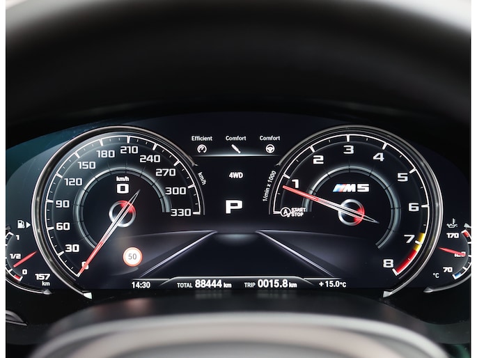 Ook op rustiger momenten voelt de M5 als een volwaardige limousine. De adaptieve LED-verlichting, de 4-zone airconditioning, de geventileerde stoelen en het Harman Kardon audiosysteem zorgen voor een sfeer van rust en luxe. U kunt ermee op pad naar een zakenafspraak of een bergpas, en in beide gevallen voelt hij zich precies op zijn plek.