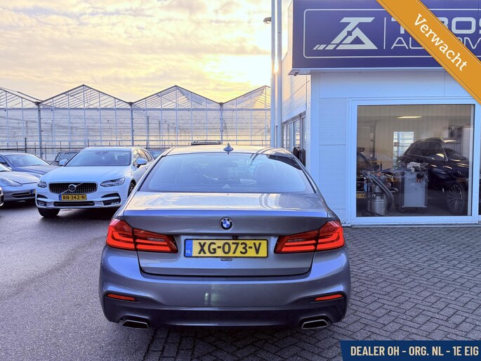 WORDT VERWACHT van 1e eigenaar afkomstig; Luxe origineel Nederlands geleverde BMW 5-serie 520i M-sport High Executive sedan van bouwjaar 2019 uitgevoerd in de kleur Bluestone Metallic metallic.