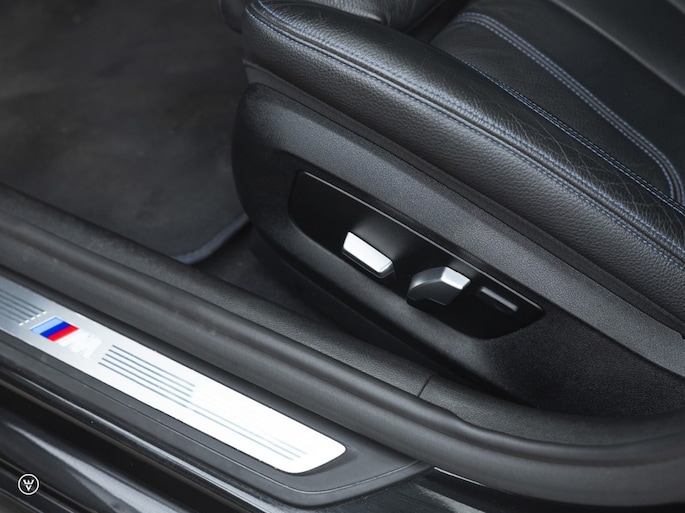 Kijken we dan naar de verdere uitvoering zien we natuurlijk het haast onmisbare M-sportpakket en met oa. Panoramadak, HeadUp, LED-koplampen en Harman Kardon highend audio de belangrijkste musthave opties – goed geraakt en erg luxe vinden wij de uitwerking van het klassieke zwart zwart thema. Saphierzwart op de koets dus, zwart leer op de elektrisch verstelbare stoelen met Memory – waar de vanwege voornoemde M-uitvoering verwerkte Motorsport driekleur behouden werd.