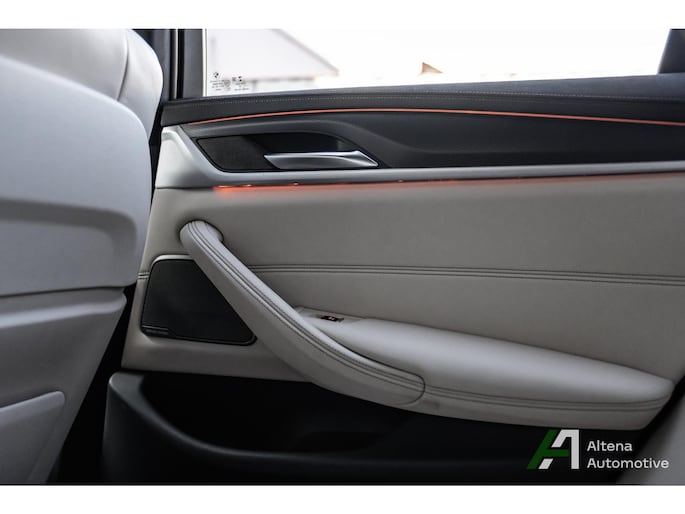 Deze BMW 540i Sedan is uitgevoerd in Phytonic Blau metallic, gecombineerd met een ivoorwit Nappa lederen interieur. Samen met het M Sportpakket en de subtiele Shadow Line accenten geeft dit de auto een uitstraling die tegelijk sportief en elegant is.