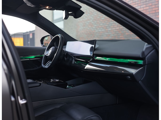 In het donkere Frozen Deep Grey Metallic staat hier een sedan die direct indruk maakt door zijn krachtige en stijlvolle uitstraling. De bijzondere kleur samen met het M Sport Pro pakket geven de BMW 550e een uitgesproken sportief karakter, versterkt door het Carbon exterieurpakket, de zwarte Shadow Line details en de 21” M velgen met rode M remklauwen.