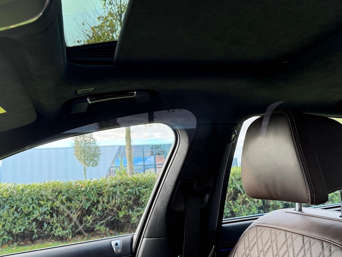 Uitgevoerd in Donington Grau Metallic met donkerbruin leder. Alcantara hemelkleding, schuif-kantel dak.