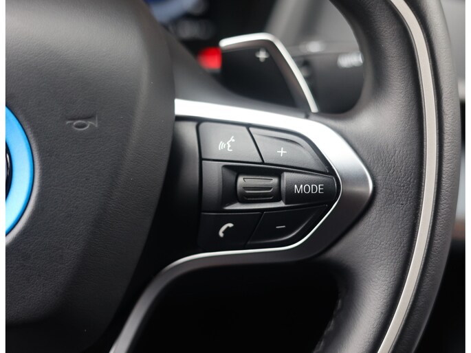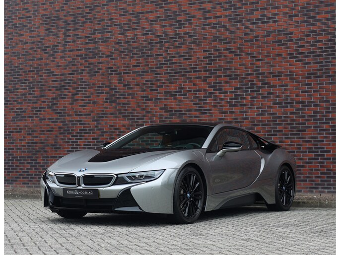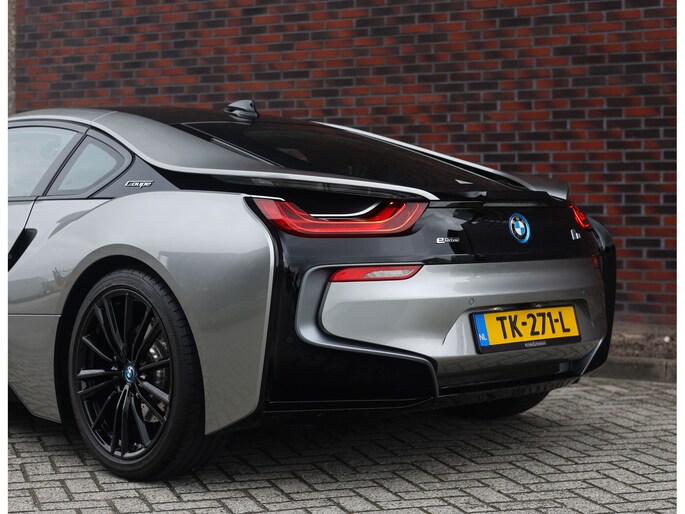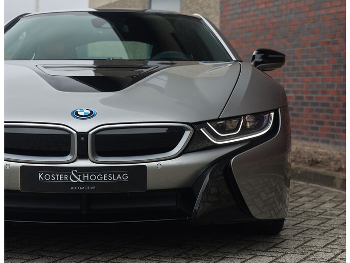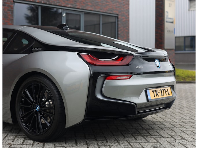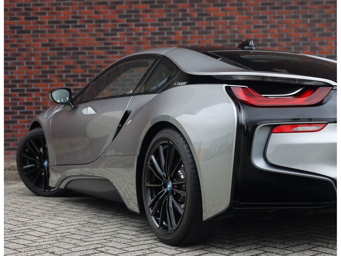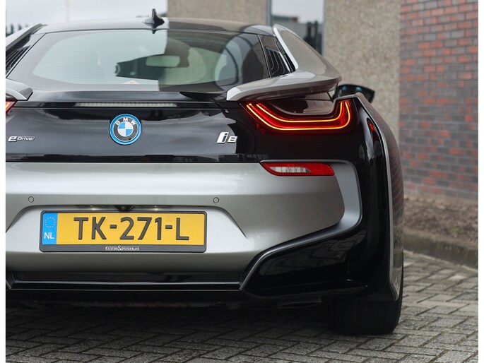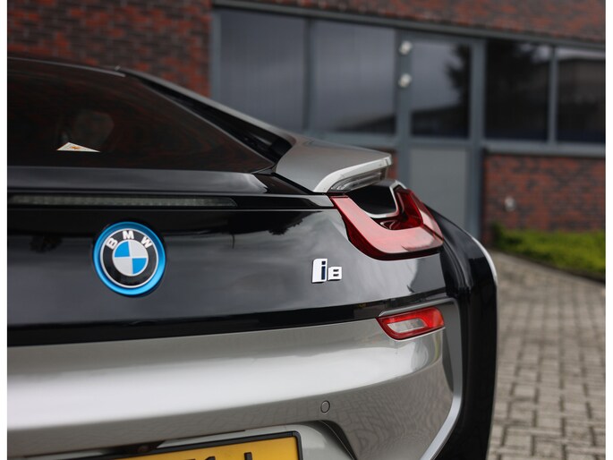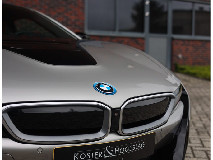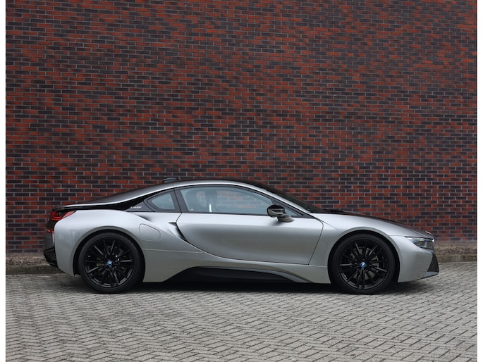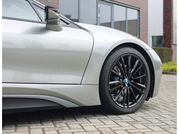 Dit exemplaar is bijzonder fraai uitgevoerd in Donington Grey metallic, wat ervoor zorgt dat de unieke lijnen van de I8 extra goed naar voren komen. De zwarte accenten op de motorkap en het dak in combinatie met de zwarte velgen bieden een mooi contrast met het lichte lakwerk en geven de I8 een extra sportieve uitstraling.
