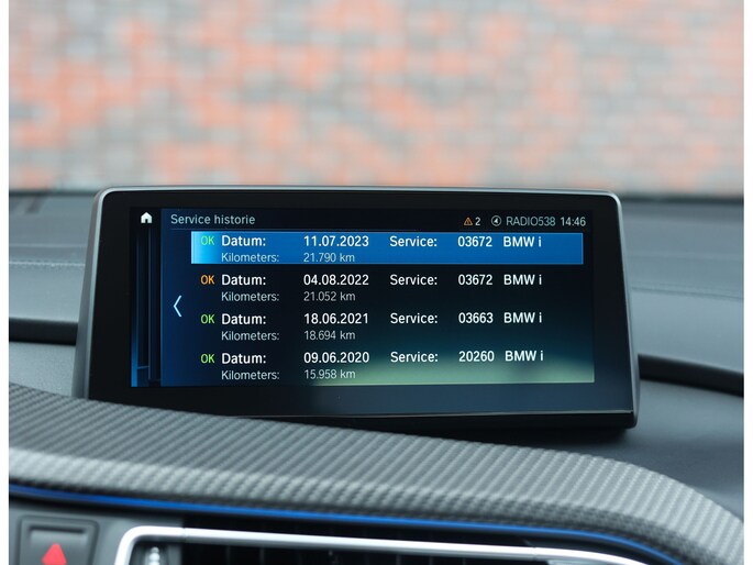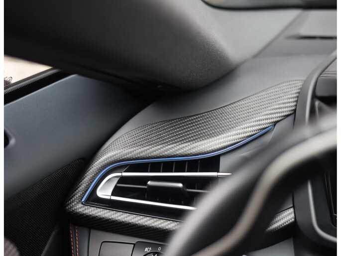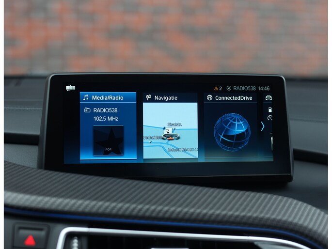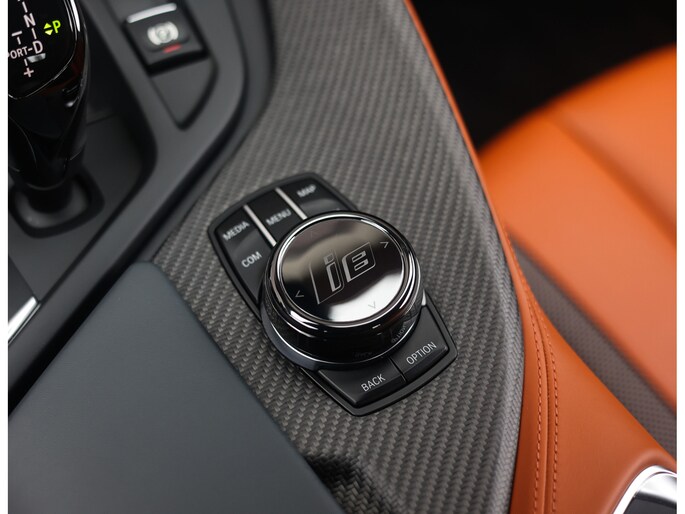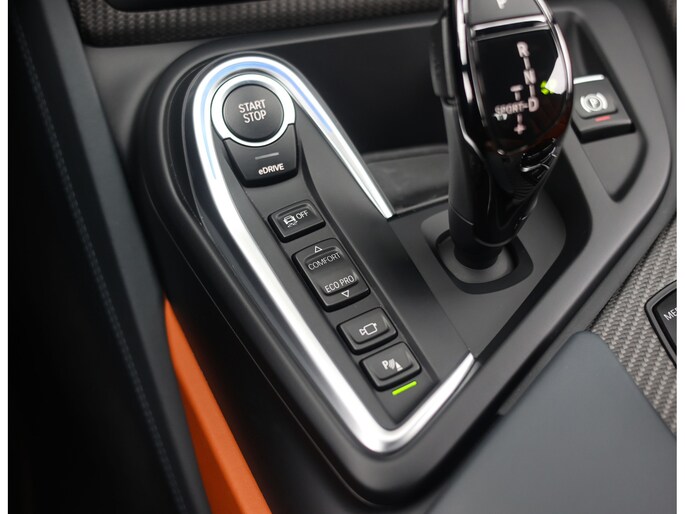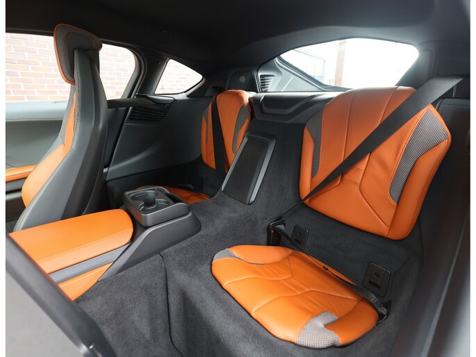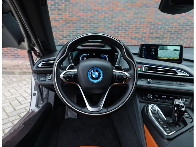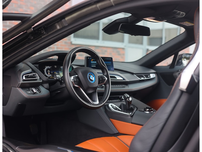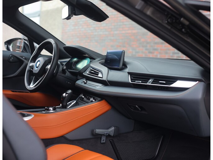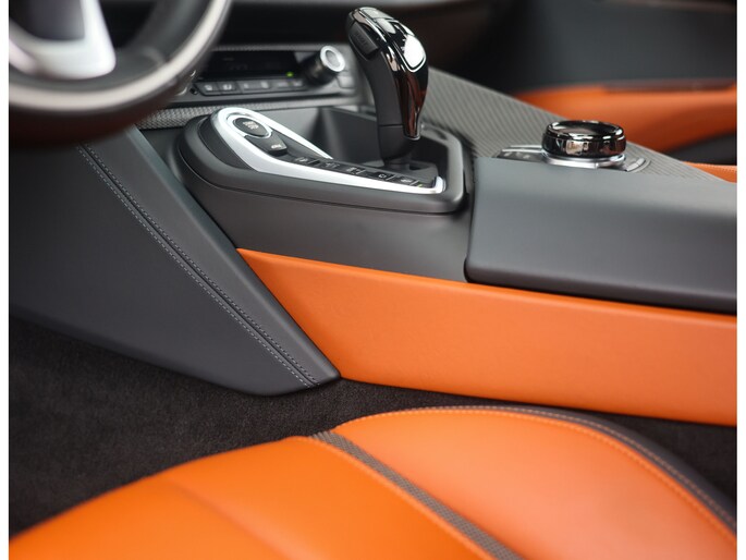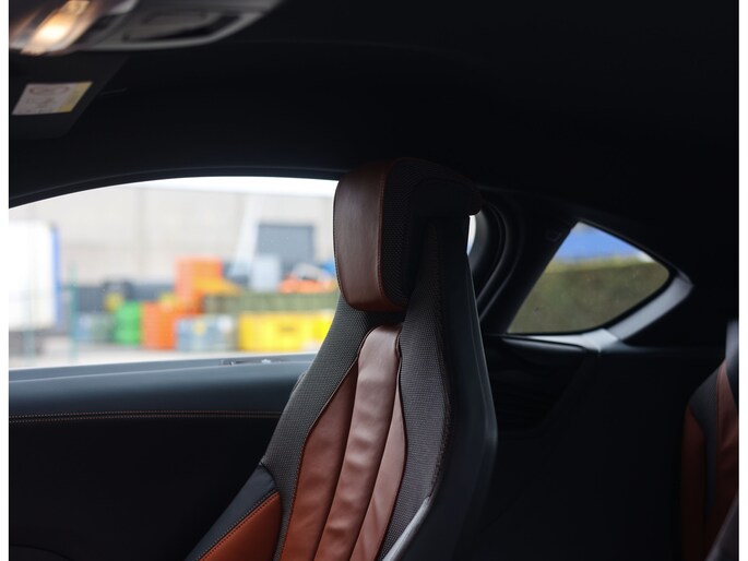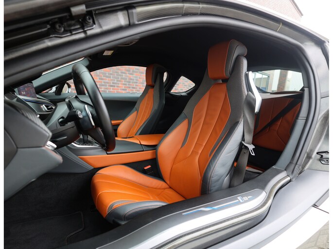 Sla de vleugeldeuren open en u waant zich in een cockpit die u het gevoel geeft dat u in een straaljager stapt. Alles is op u als bestuurder gericht. De bekleding is hoogwaardig afgewerkt in koperkleurig en zwart leder met koperkleurige stiksels. Zelfs de kofferruimte boven de motor is bekleed met leder voor een extra exclusief gevoel. Daarnaast is deze I8 zeer rijk uitgerust, zo geniet u van stoelverwarming, Harman Kardon audio, head-up display en keramische bedieningselementen.