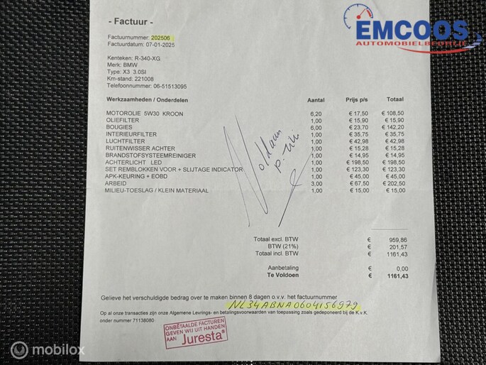 De BMW X3 heeft op 29/01/2024 en bij kilometerstand 201100 een motor revisie gehad de factuur hiervan is aanwezig.