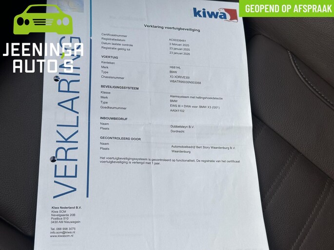 In één oogopslag zijn alle vitale functies afleesbaar dankzij het digitale dashboard. De vier camera's die samen de 360 graden camera vormen, bieden u de mogelijkheid om obstakels in elke richting te zien. Deze BMW X3 is voorzien van remote services. Via uw smartphone bedient u diverse functies ook op afstand en krijgt u informatie over de status van uw auto. Deze BMW is voorzien van spraakbediening voor het navigatiesysteem en voor het audiosysteem met DAB-ontvangst. Maar u kunt ook de knoppen op het stuur gebruiken. Bij het wisselen van rijbaan kan een dode hoek ontstaan waardoor achterliggers te dichtbij kunnen komen. De achteropkomend verkeer waarschuwing geeft in dat geval automatisch een signaal. Deze auto is voorzien van automatische airconditioning,regensensor, cruise control, sportstuurwiel, automatisch dimmende binnenspiegel en isofix-aansluiting.