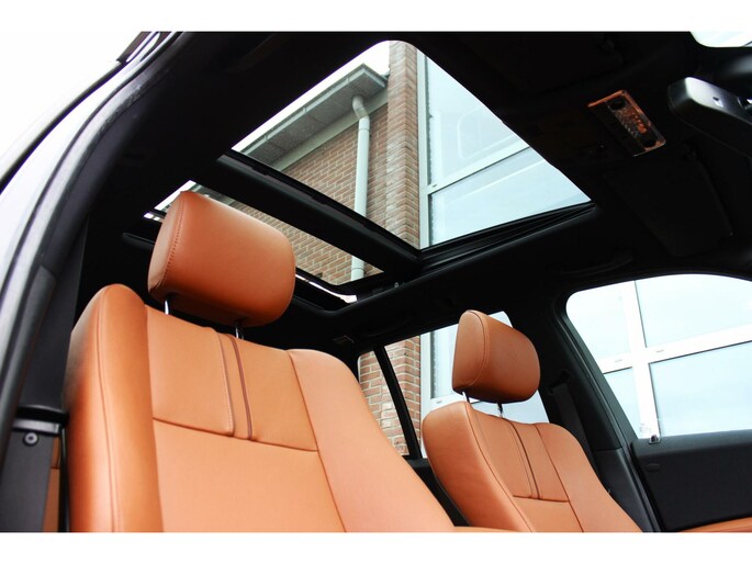 Van binnen een Cognac lederen sport interieur met zwart kleurige hemelbekleding en een elektrisch panoramisch schuif/kantel dak. Achterin een deelbare achterbank met ISO-fix aansluitingen.