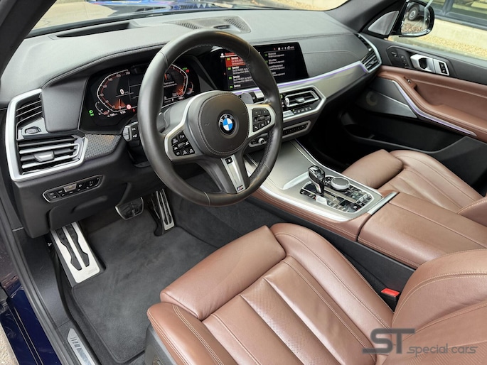 Deze X5 is écht een eyecatcher, onder andere door de exclusieve BMW Laserlight koplampen, het indrukwekkende panoramadak Sky Lounge en de tijdloze kleur Tansanitblau II metallic. Binnenin wordt u verwelkomd door een hoogwaardige afwerking met Leder Vernasca koffie, sfeerverlichting en het indrukwekkende Bowers & Wilkins High End audiosysteem.