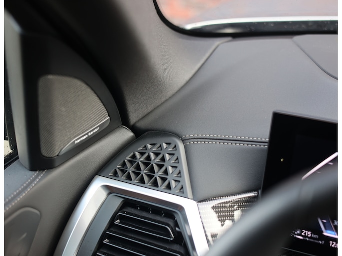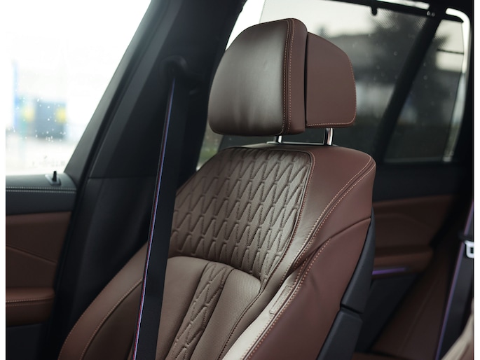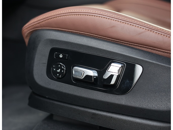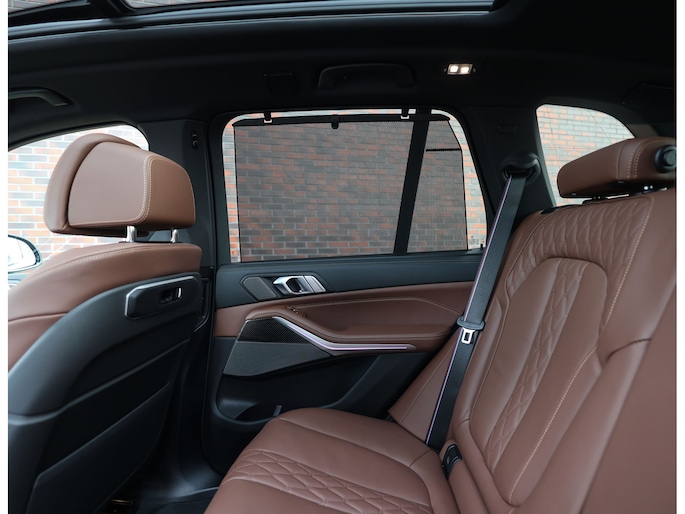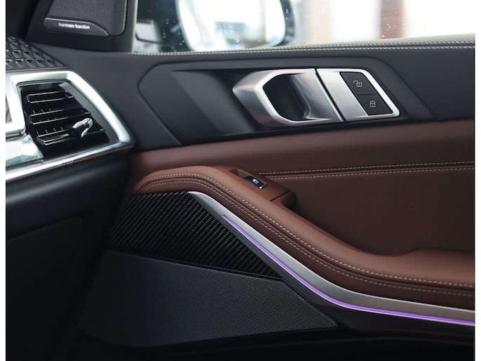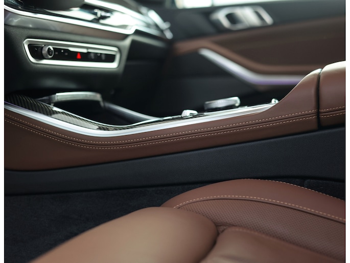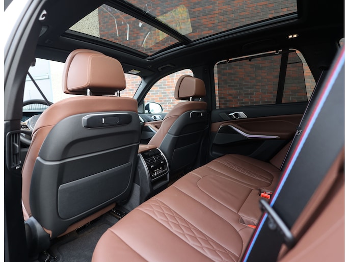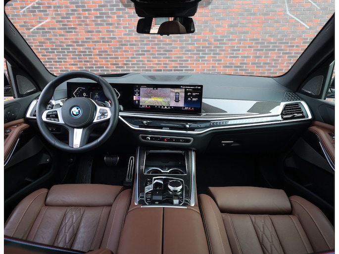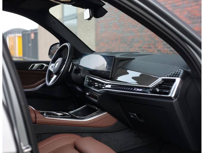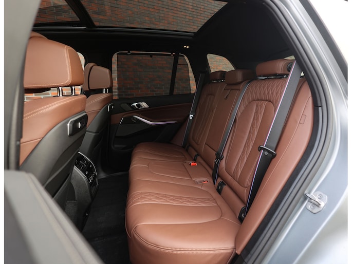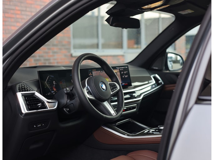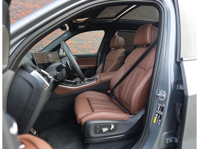 Het interieur van deze BMW X5 staat volledig in het teken van luxe en comfort. De comfortstoelen met ventilatie en verwarming zorgen voor hoogwaardig zitcomfort, terwijl het Harman Kardon audiosysteem een rijke geluidsbeleving biedt. De Merino lederen bekleding in de unieke Coffee-kleur geeft het interieur een warme en exclusieve uitstraling.