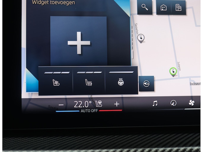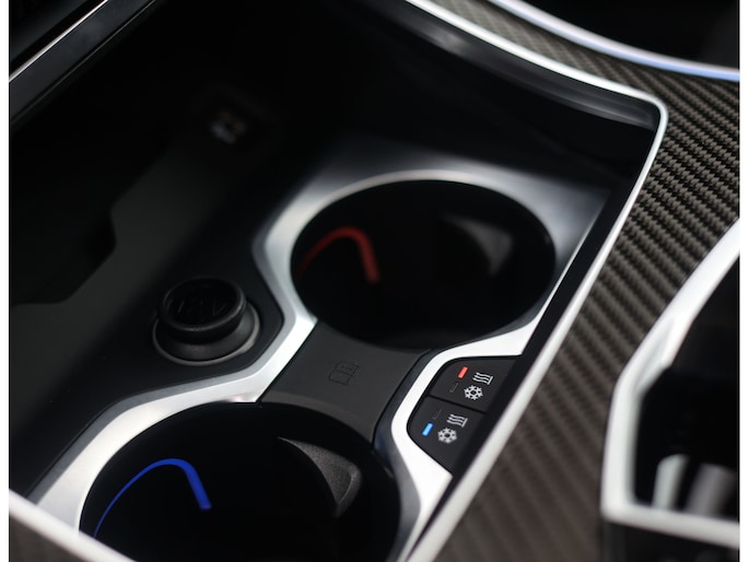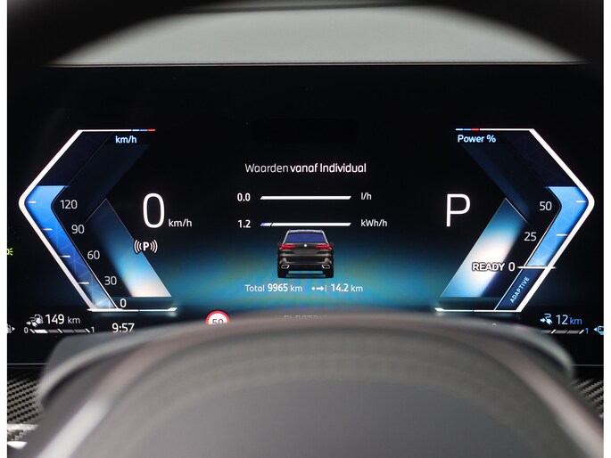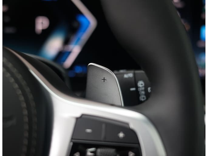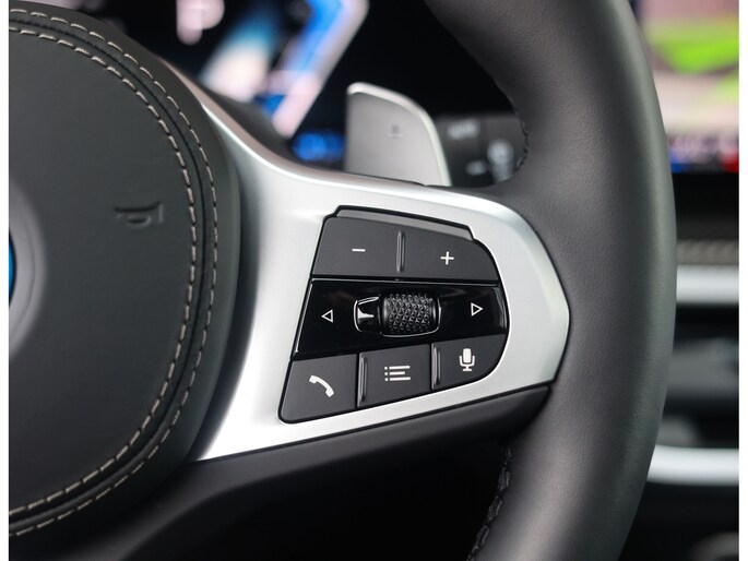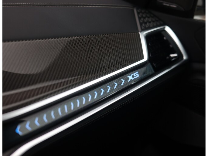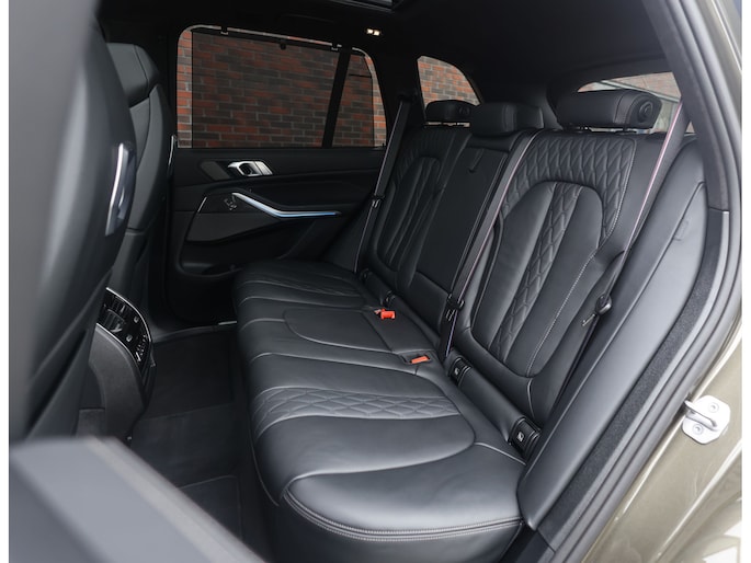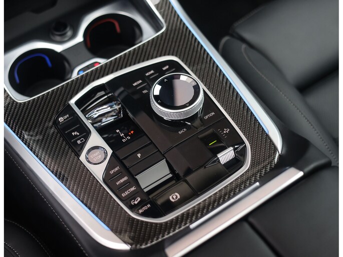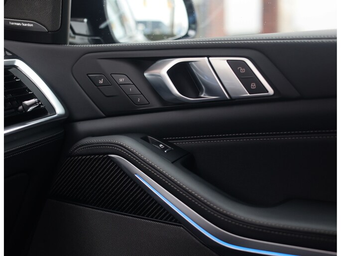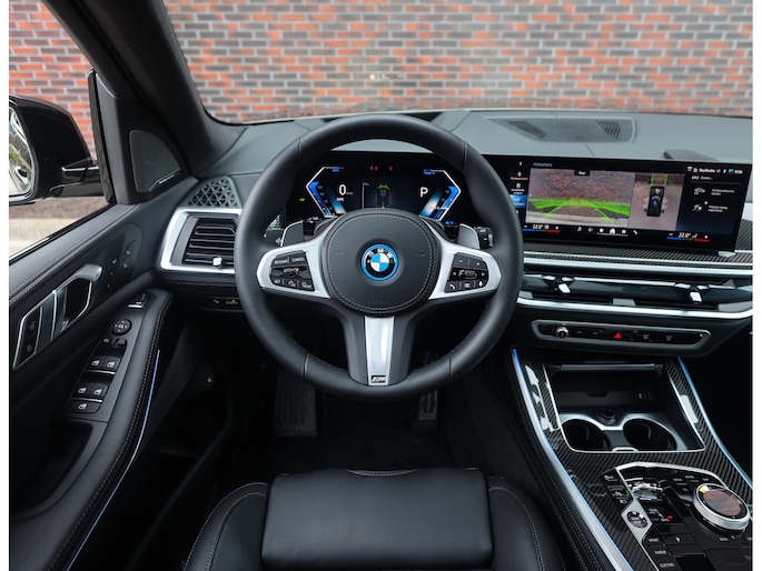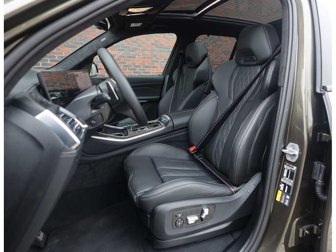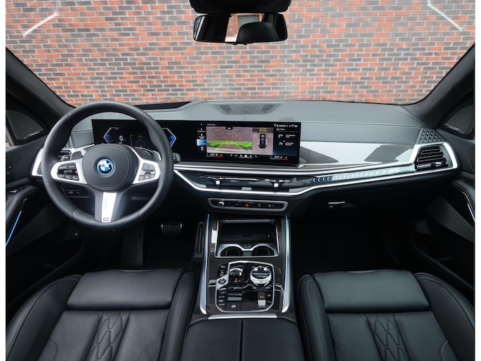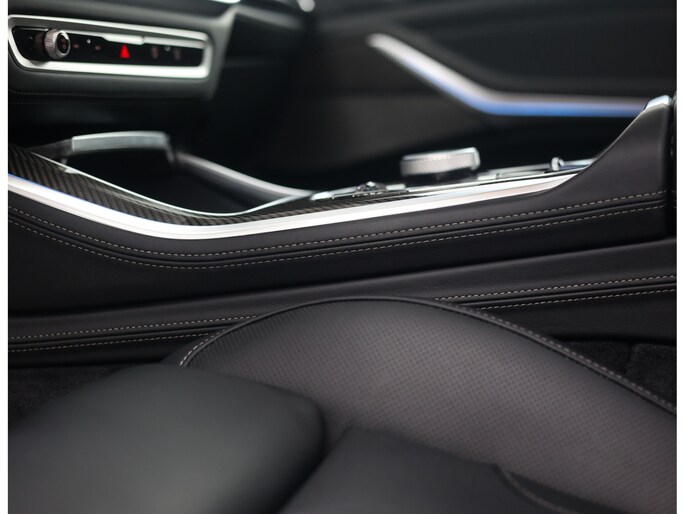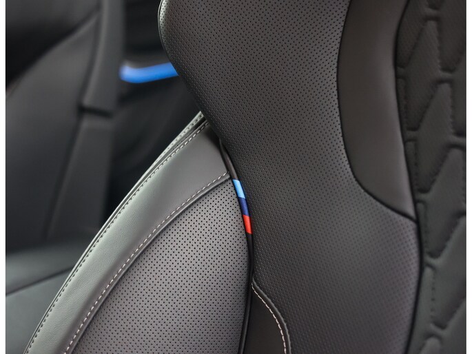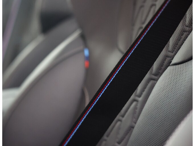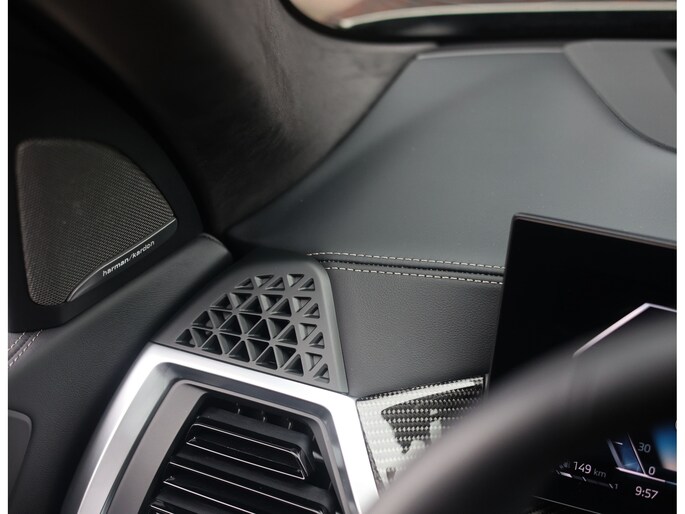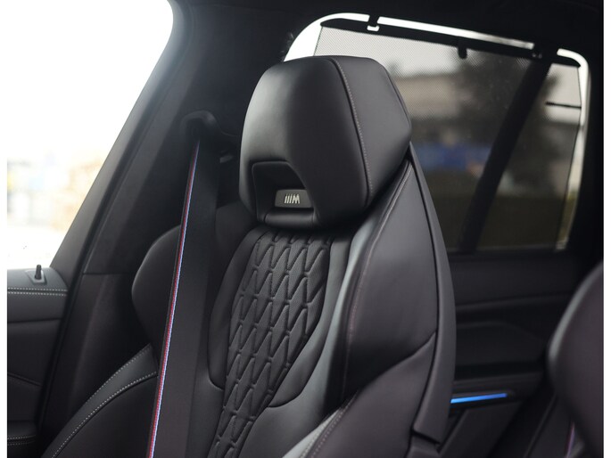 Dat zien we ook terug in het interieur. De lederen M‑stoelen bieden zowel voor- als achterin verwarming, en voorin zelfs een massagefunctie. Het glazen panoramadak, het Harman Kardon sound system en de Carbon Fibre interieurlijsten benadrukken de sportieve en luxe uitstraling. Alles is afgewerkt in zwart Merino lederen bekleding, compleet met de iconische M‑gordels.