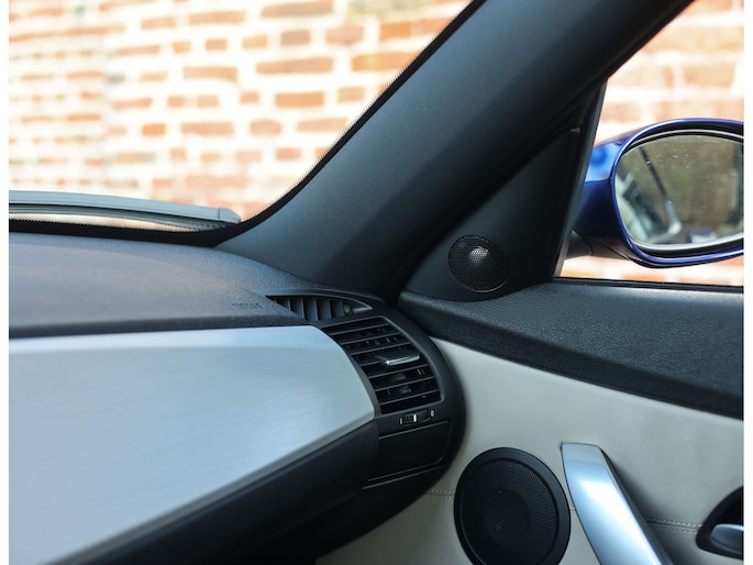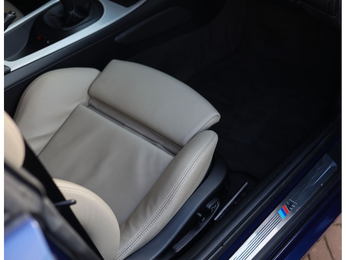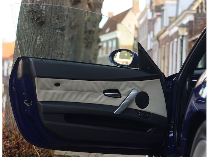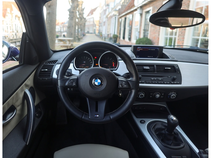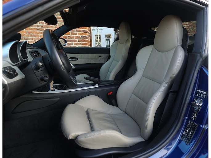 Het exterieur van dit specifieke exemplaar is uitgevoerd in Interlagosblauw metallic, een kleur die perfect past bij het sportieve en exclusieve karakter van de Z4 M Coupé. In het licht komt de metallic lak prachtig tot leven en worden de gespierde lijnen van de carrosserie extra benadrukt. De lange motorkap, brede wielkasten en de kenmerkende coupé-achterzijde geven de auto een krachtig en compact silhouet. Het design is uitgesproken en tijdloos tegelijk, waardoor de auto nog altijd modern oogt en direct de aandacht trekt.
