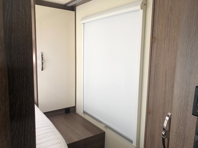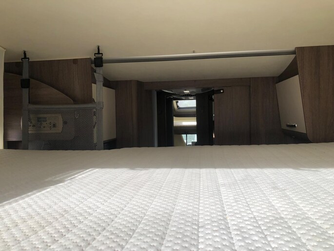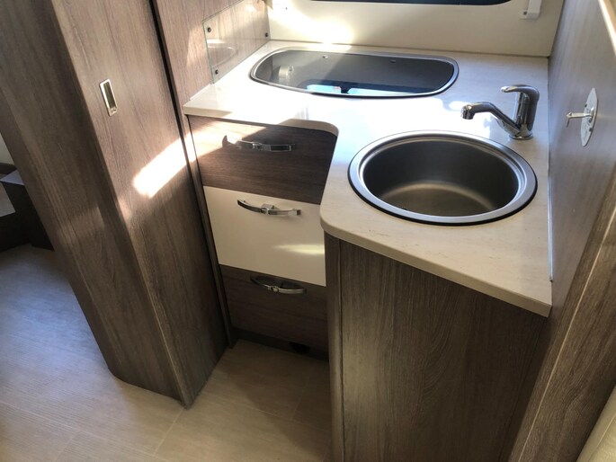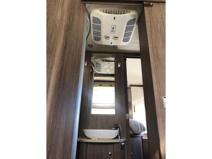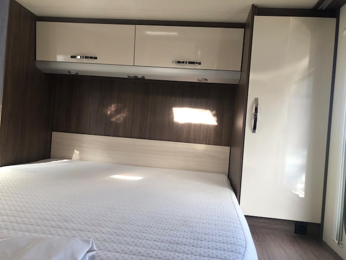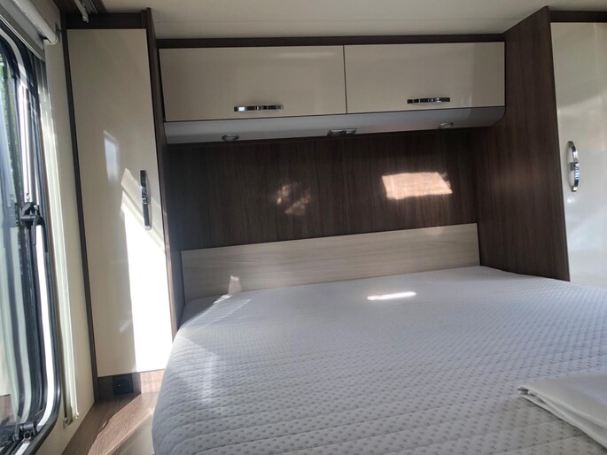 Camper verkeert in nette en goede staat in een luxe uitvoering en met een fijne indeling, aparte slaapkamer douche en toilet apart met wasbak in de midden.