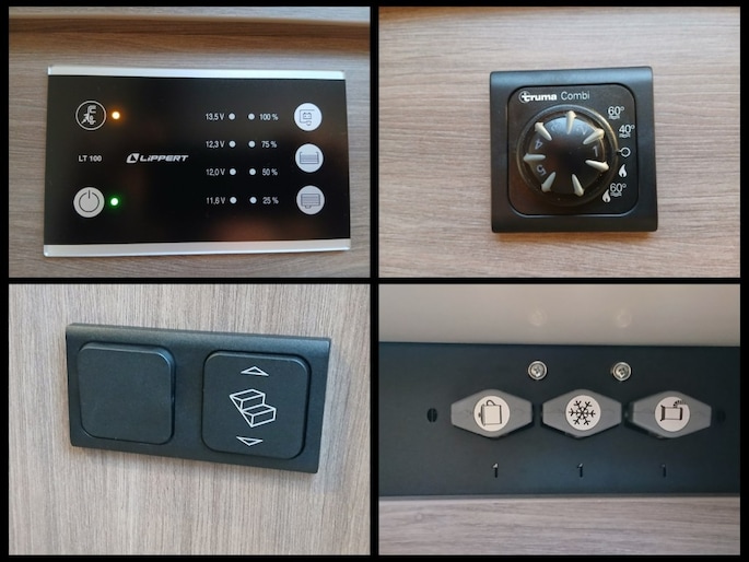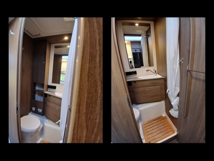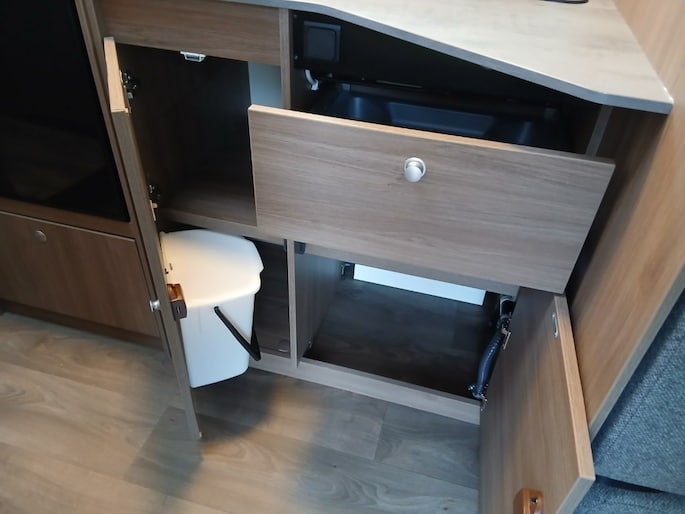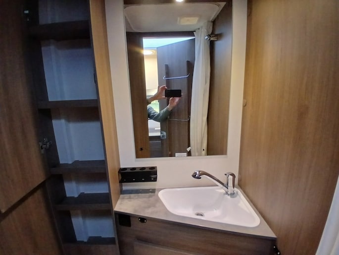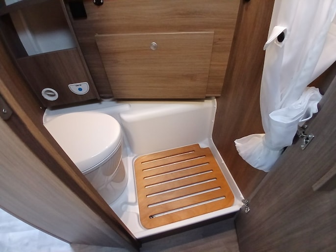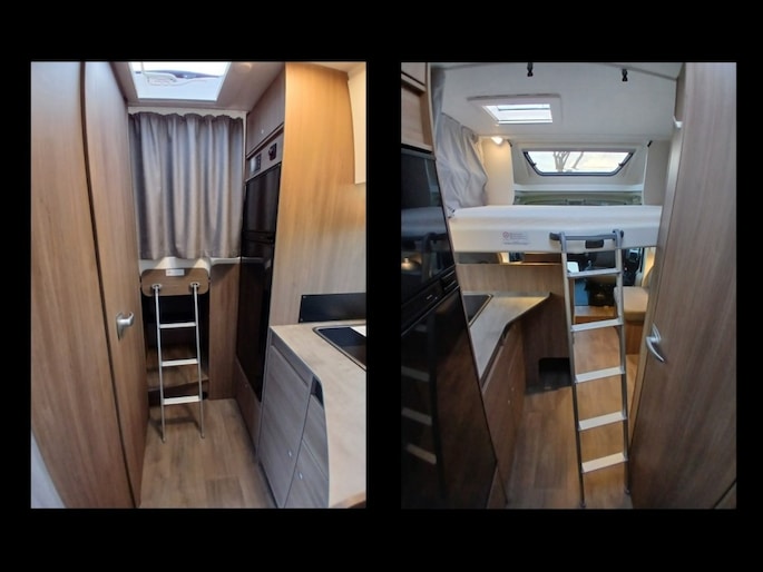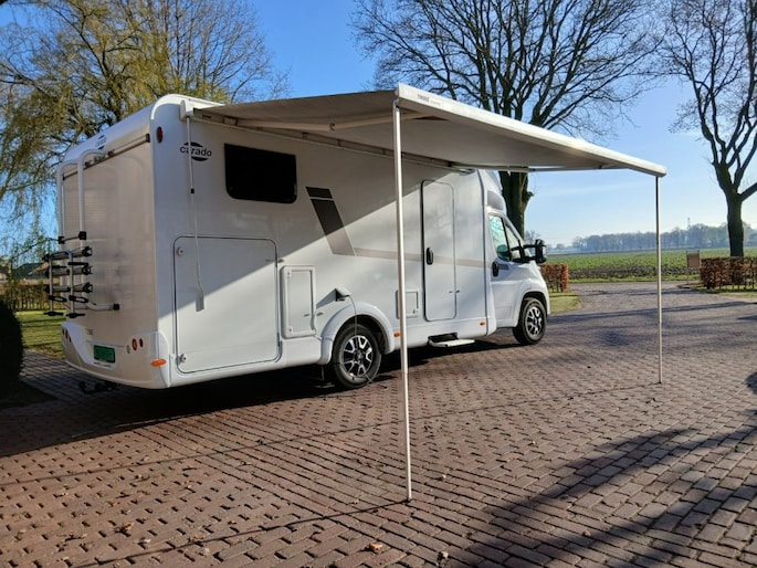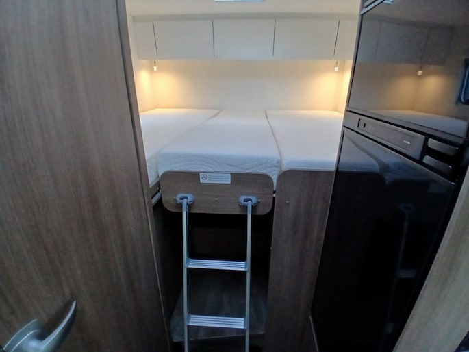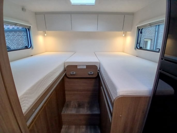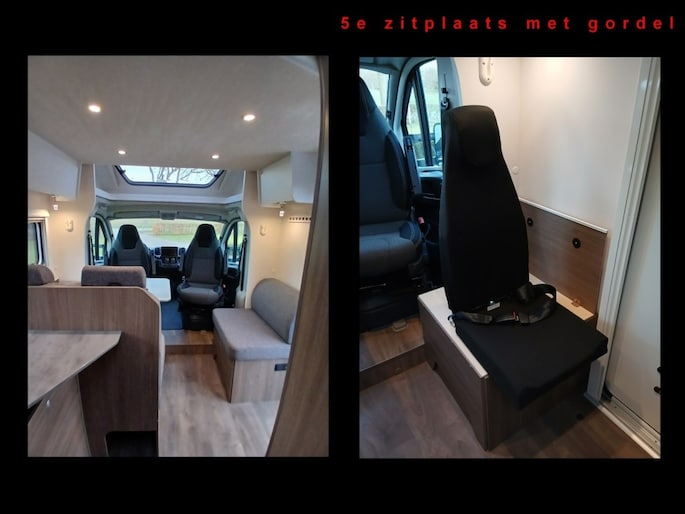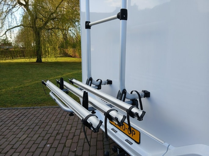 Hefbed (3e en 4e slaapplaats) Bedombouw van de zitgroep (5e slaapplaats) 5e zitplaats met gordel Houten douchevlonder Fiestsdrager voor 3 fietsen Trekhaak (vast) 2000 750 kg. Navi multimedia radio camera