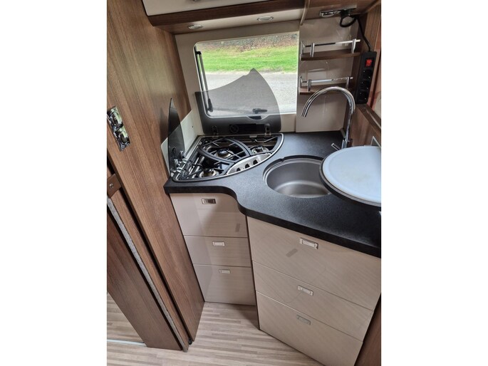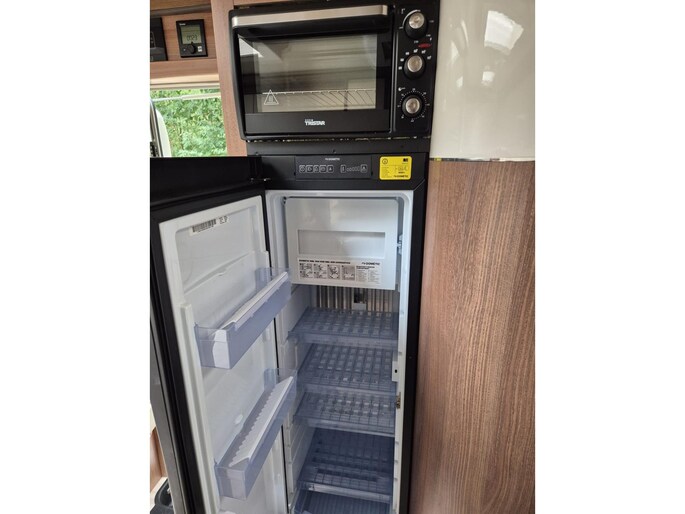 De luxe keuken biedt veel opbergruimte en is voorzien van een grote Dometic koel-vriescombinatie en gasoven.
