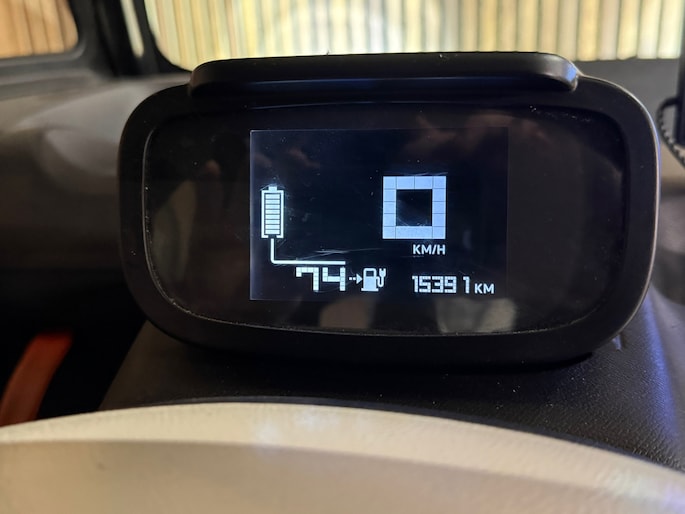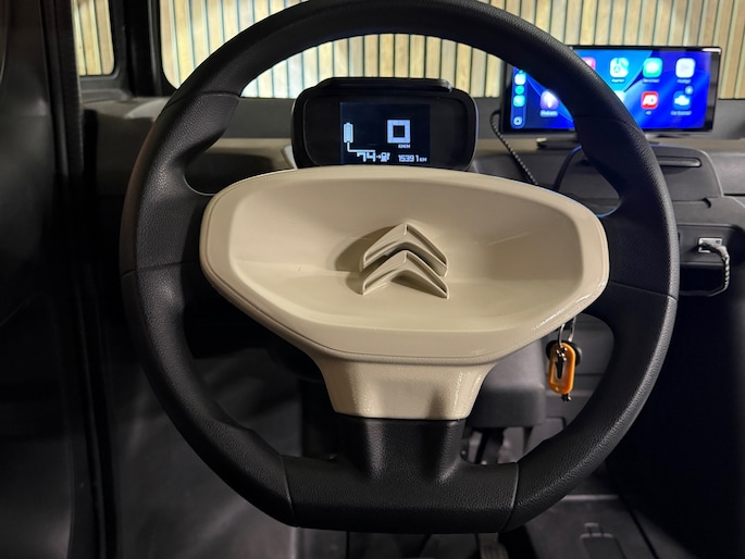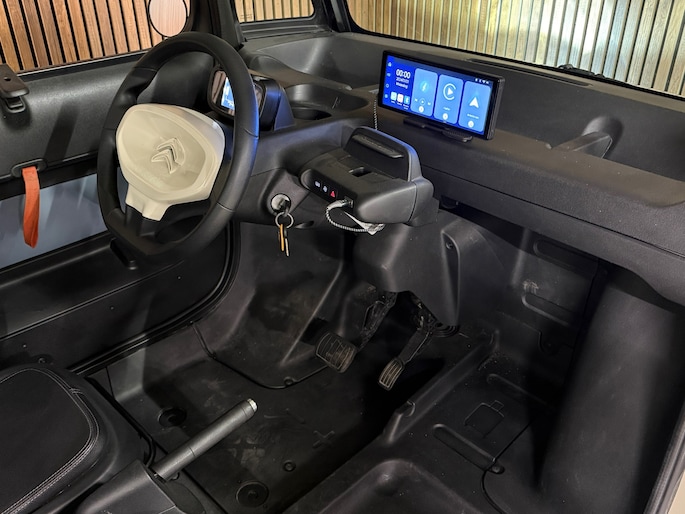 Binnenin is hij simpel maar slim. Compleet met een CarPlay-systeem, dus muziek, navigatie en je favoriete apps altijd binnen handbereik. Hij rijdt elektrisch, stil en comfortabel tot 45 km/u, en parkeren kan bijna in je gangkast.