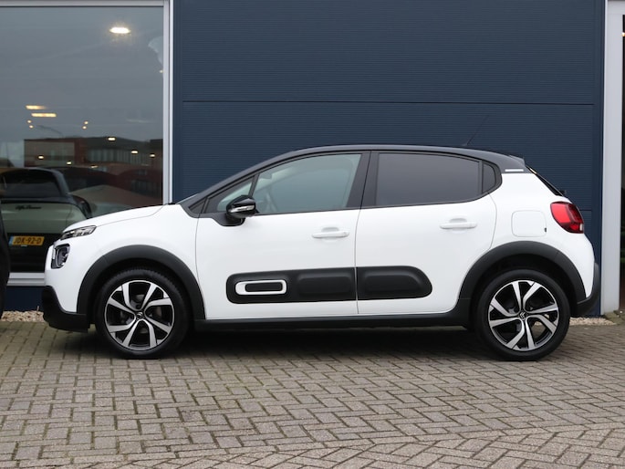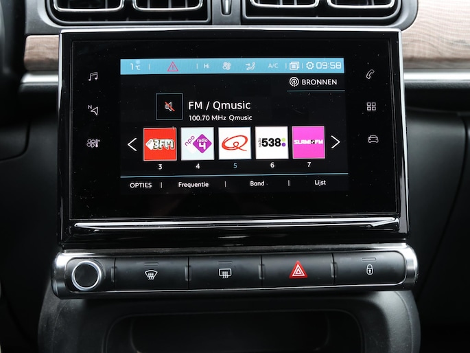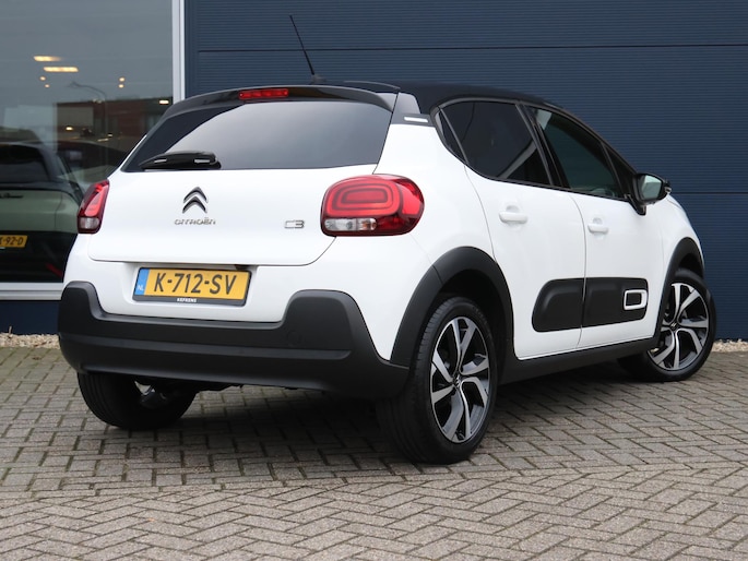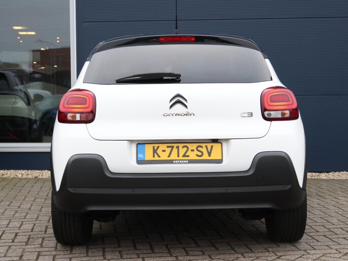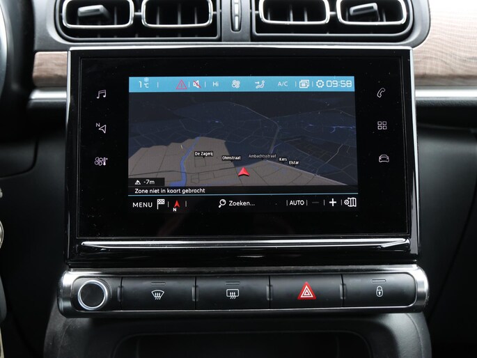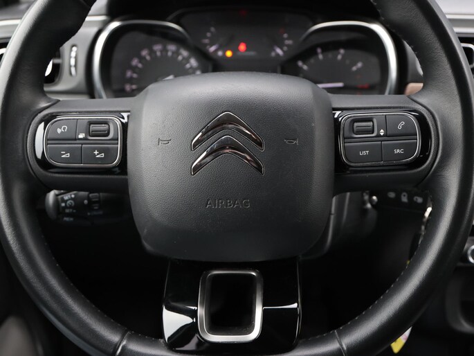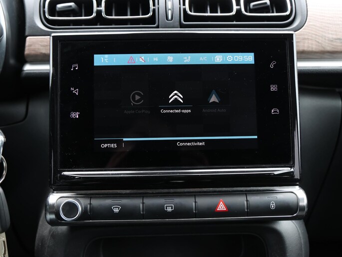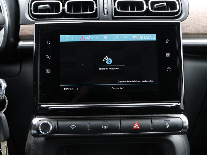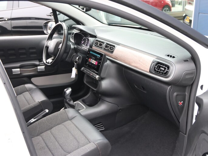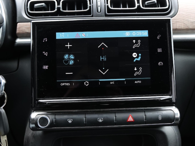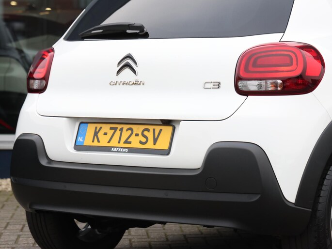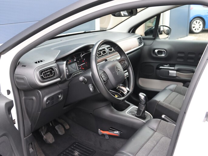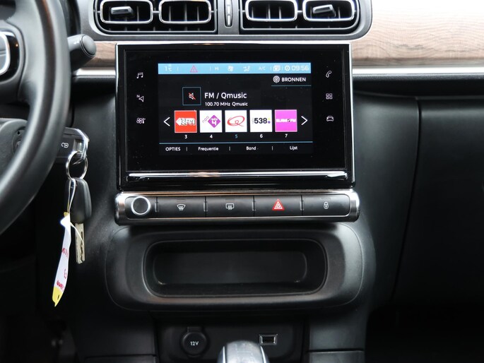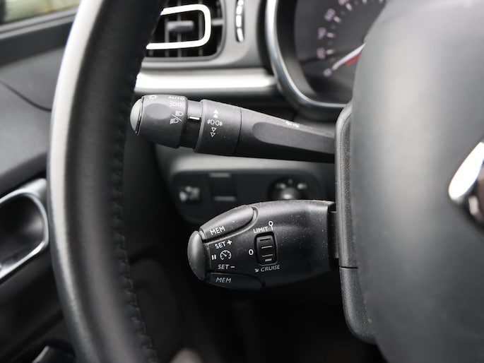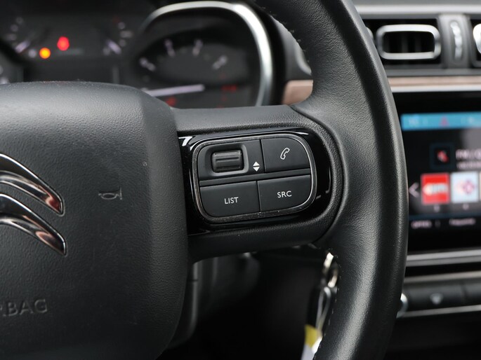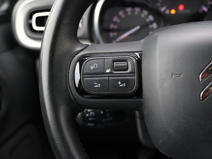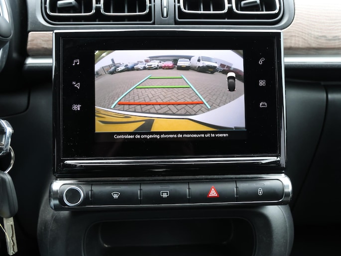 Niets achter deze auto blijft verborgen door de achteruitrijcamera. Een veilig gevoel! Met uw smartphone maakt u overal contact met de auto. Remote services geven direct inzicht in uiteenlopende functies en zijn op afstand te activeren. Uw veiligheid op de weg wordt verhoogd door het audiosysteem met DAB-ontvangst en het full map navigatiesysteem te bedienen vanaf het stuur of met spraakbediening, zodat uw handen veilig op het stuur blijven en uw ogen gericht zijn op de weg. Omdat u nu eenmaal niet overal ogen heeft, is deze Citroen C3 voorzien van een achteropkomend verkeer waarschuwing die registreert wanneer de afstand tot uw achterligger te krap is. Nooit meer te warm of te koud. De automatische airconditioning zorgt altijd voor de temperatuur die u kiest. De Citroen is standaard voorzien van: regensensor, cruise control, automatisch dimmende binnenspiegel, lederen stuur, centrale deurvergrendeling met afstandsbediening en boordcomputer.