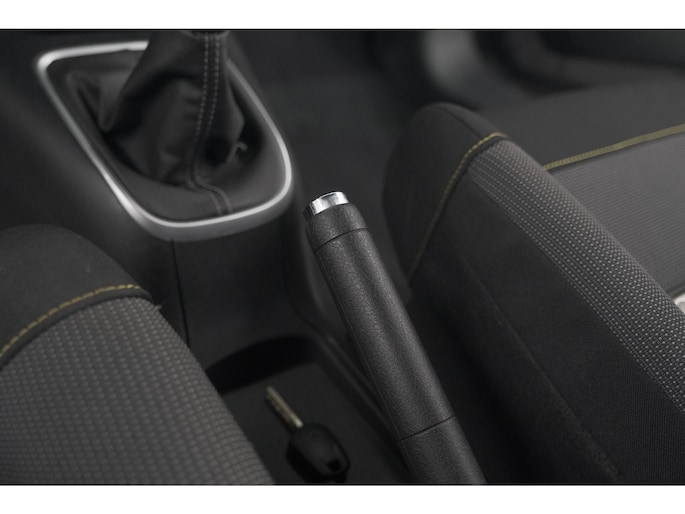 Interieurkleur: Stof 'mica grey' met geel accent stiksel