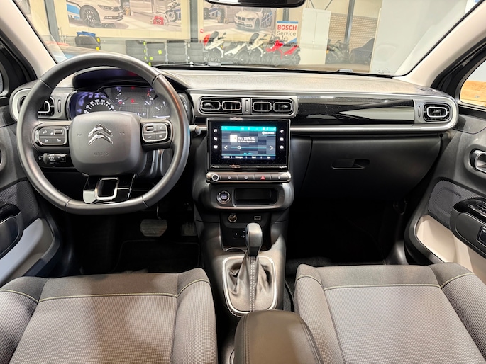 Alle technologie in de Citroen C3 is er op gericht om uw rit veilig en gemakkelijk te laten verlopen. De aandrijving van deze Citroen wordt verzorgd door een driecilinder motor en een automatische transmissie. Bij de zeer complete uitrusting van deze auto behoren ook 16 inch lichtmetalen velgen, LED koplampen, extra getint glas, in delen neerklapbare achterbank en snelheidsafhankelijke stuurbekrachtiging.