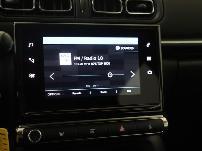 Kies de muziek waarvan u houdt, dankzij de DAB-radio klinkt het altijd geweldig. Intussen bedient u het audiosysteem en het navigatiesysteem met de knoppen op het stuur of met uw stem. De achteropkomend verkeer waarschuwing is een mooie veiligheidsoptie, die middels sensoren in de gaten houdt wat er onderweg achter u gebeurt. De automatische airconditioning zorgt onder alle omstandigheden voor een prettige temperatuur. Het drukke verkeer eist onderweg al uw aandacht op. Daarom is het goed dat deze Citroën is voorzien van diverse systemen die u assisteren tijdens de rit. Een automatisch inschakelbare verlichting neemt het waar als het donker wordt of gaat schemeren, en schakelt dan automatisch de verlichting in. Op dezelfde manier "ziet" de regensensor de eerste spatjes regen en schakelt dan de ruitenwissers in, en als het harder gaat regenen zet hij de ruitenwissers ook in een snellere stand. De cruise control geeft elke flitser het nakijken. Natuurlijk behoren automatisch dimmende binnenspiegel, centrale deurvergrendeling met afstandsbediening, boordcomputer en verstelbaar stuur ook tot de uitrusting van deze complete auto.