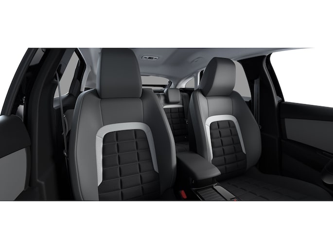 Interieur: Bekleding 'Hello Black' stof en lichtgrijze stof met ledereffect (zwart / lichtgrijs met een smalle lichtgrijze baan)