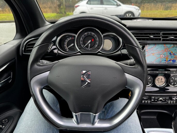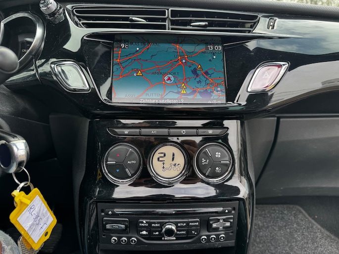 Smakelijke subs en knisperend hoog: het high performance audiosysteem geeft elke frequentie een kwaliteitsbehandeling voor akoestisch genieten onderweg. De kortste weg, de zuinigste weg, de snelste weg... elke weg is te vinden met het navigatiesysteem. Of het buiten nu warm is of koud, dankzij automatische airconditioning is het binnen altijd behaaglijk. Niet meer op de tast een andere zender zoeken of het volume aanpassen. En al helemaal niet met uw ogen van de weg af raken. De audiobediening op het stuur zorgt dat u alles van onder uw vingers regelt. Boem is ho? Niet bij deze Citroen DS3 Cabrio. De piepjes van de parkeersensoren waarschuwen u op tijd voor obstakels. Deze Citroen is voorzien van regensensor, cruise control, automatisch dimmende binnenspiegel, lederen stuur, centrale deurvergrendeling met afstandsbediening en boordcomputer.