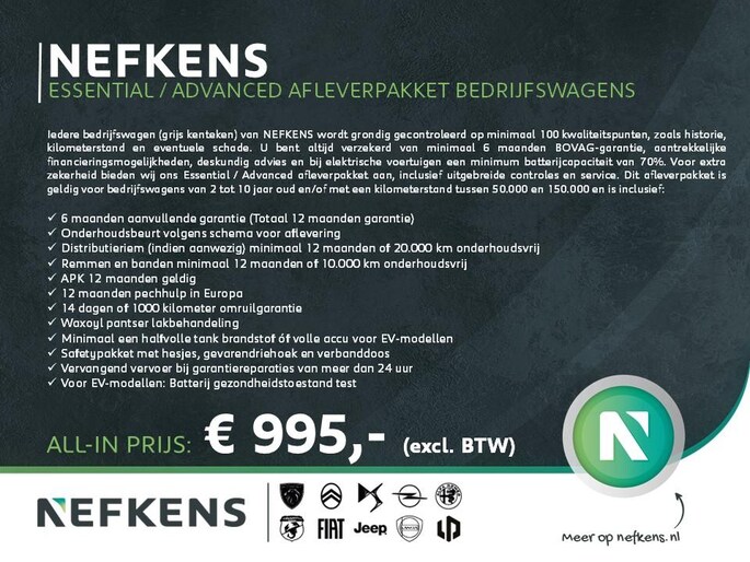 Dit afleverpakket bevat: BOVAG garantie (12 maanden) - Nefkens Essential / Advanced Bedrijfswagens (€ 995 ex BTW meerprijs):