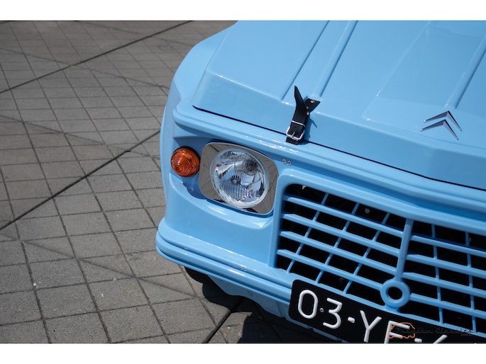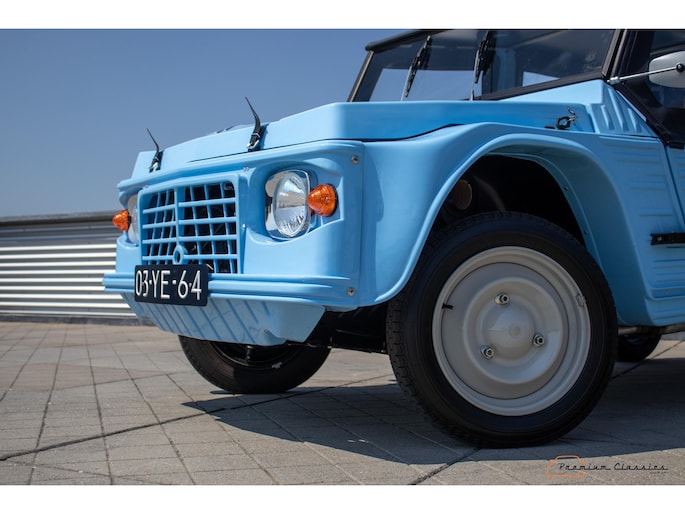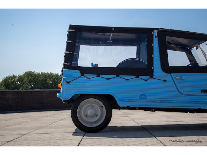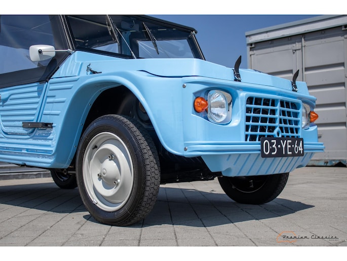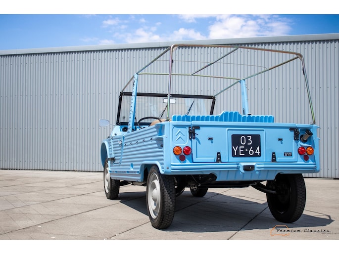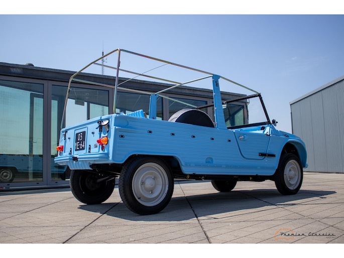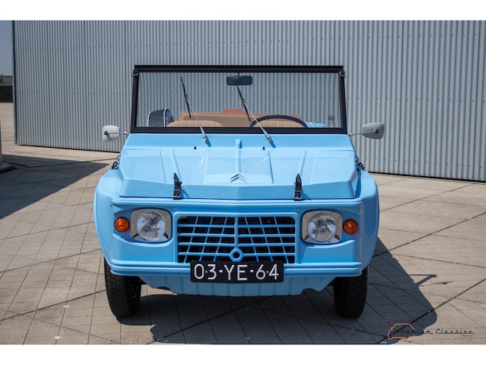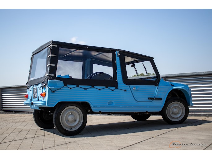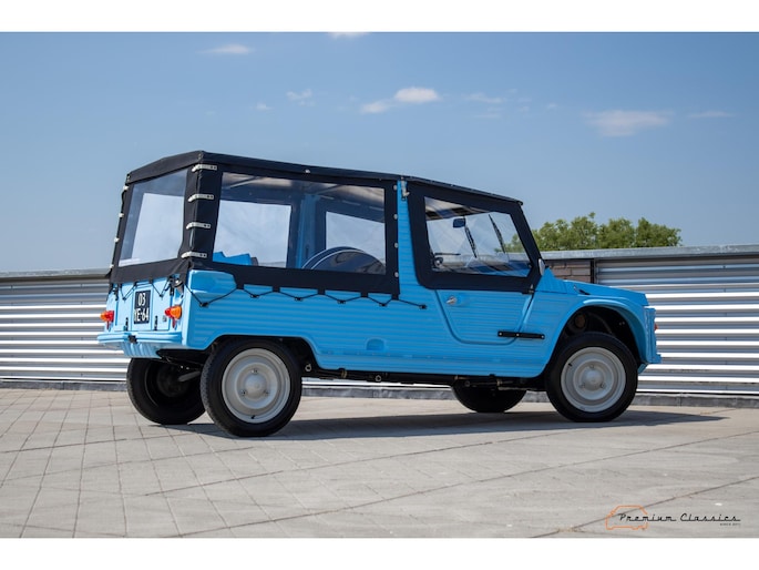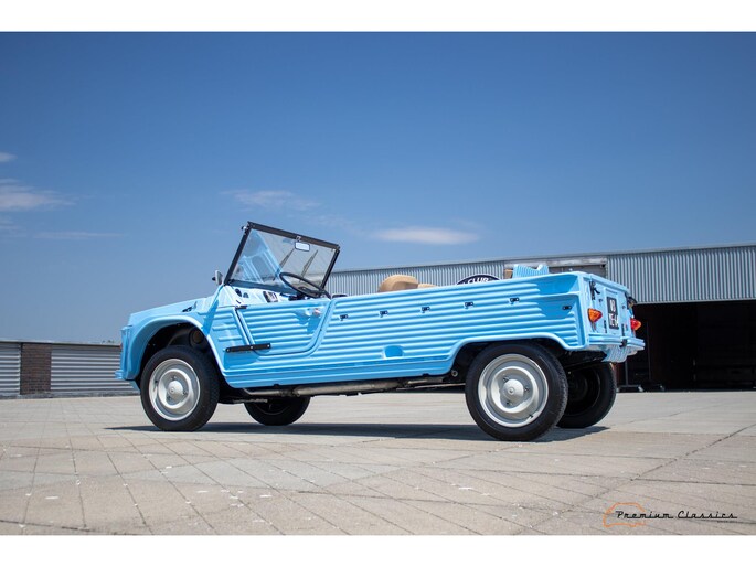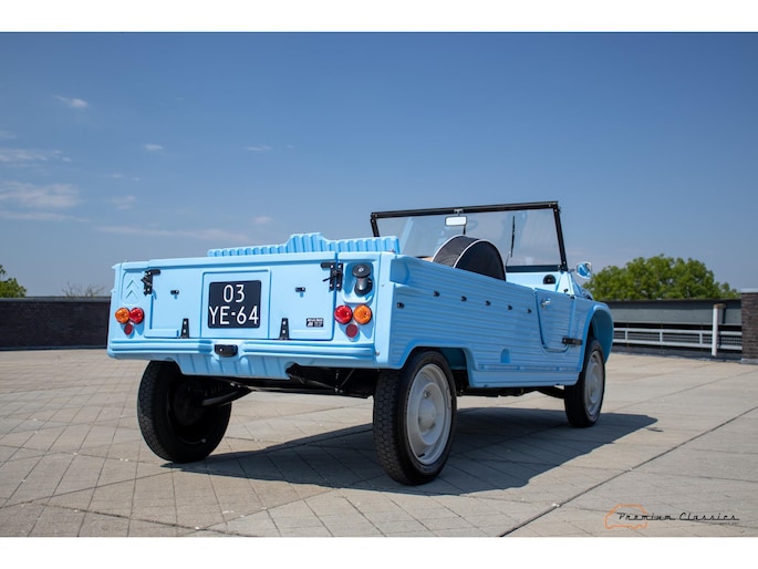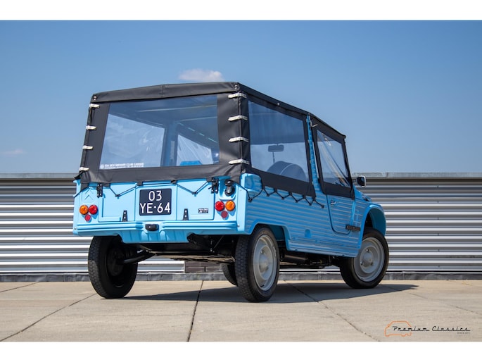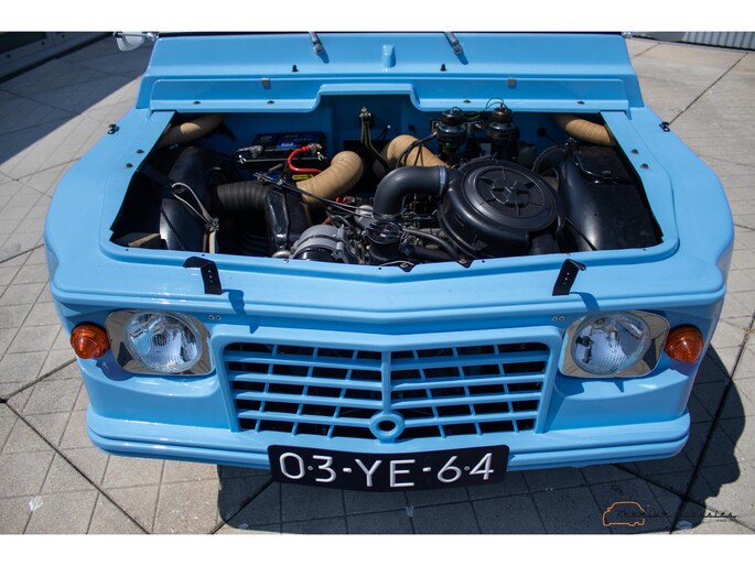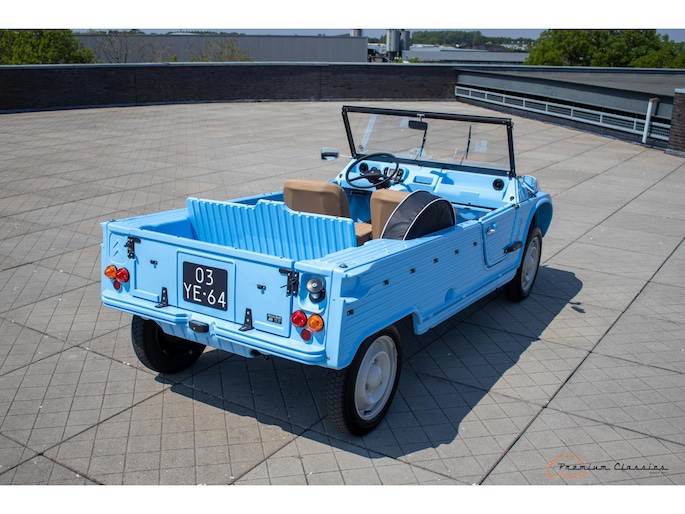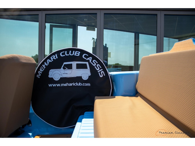 Citroën Mehari uit 1974 in nieuwstaat. Door Ad v.d. Horst compleet onder handen genomen en na restauratie slechts 50km gereden. Geleverd in “Bleu Calanque” met een zandkleurig gewoven vinyl interieur. Een fraaie, zomerse uitvoering. In de basis Citroën 2CV met design elementen van onder andere de Dyane. De auto is vernoemd naar de snel rennende dromedaris; de Mehari.