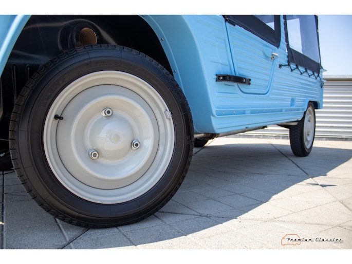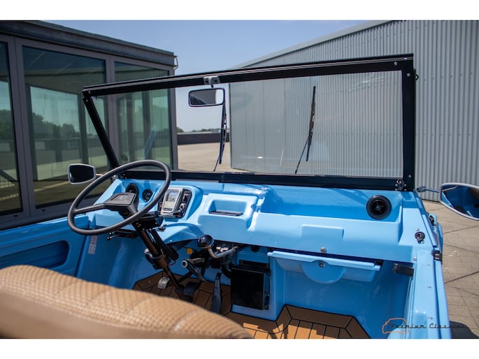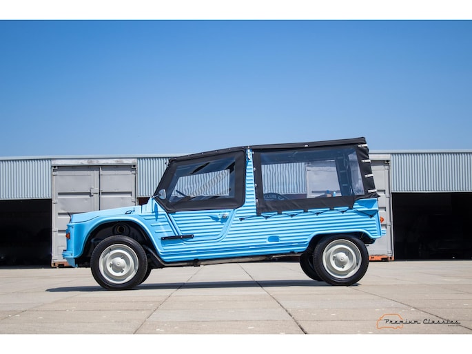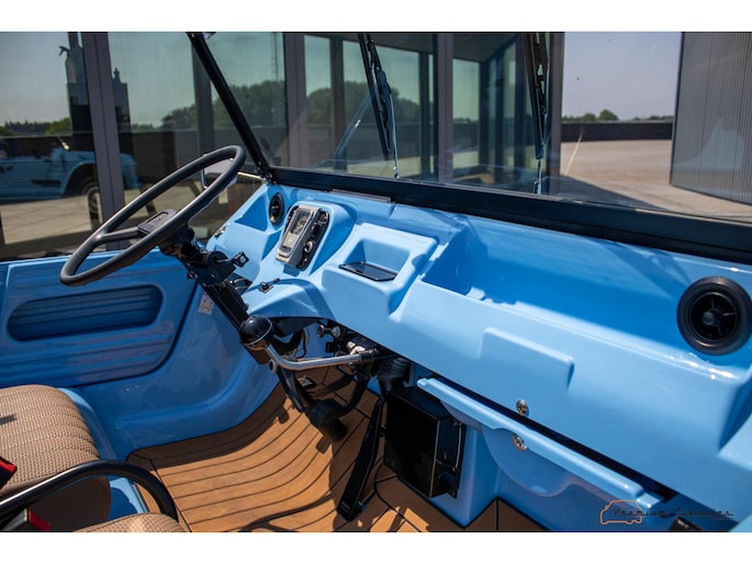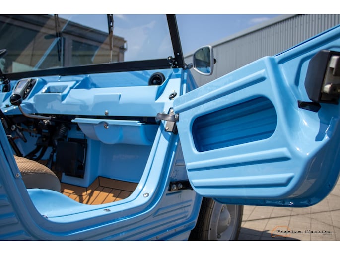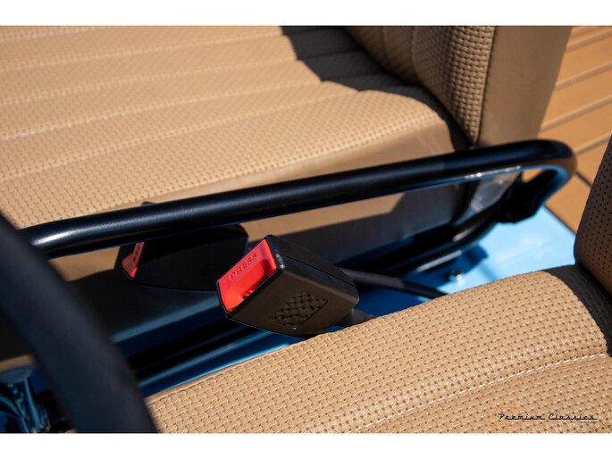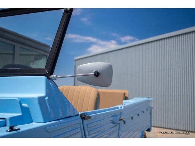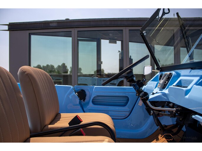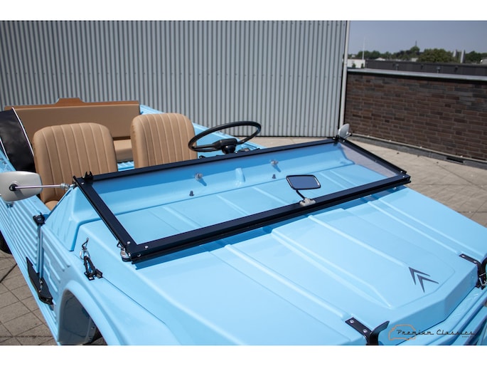 Citroën Mehari from 1974 in new condition. Fullly restored by Ad v.d. Horst and only 50km driven after restauration. Delivered in “Bleu Calanque” with a sand colored woven vinyl interior. A beautiful color combination with great summer vibes. The Mehari is based on the Citroën 2CV with design elements from the Dyane. The car is named after the fast-running dromedary; the Mehari.