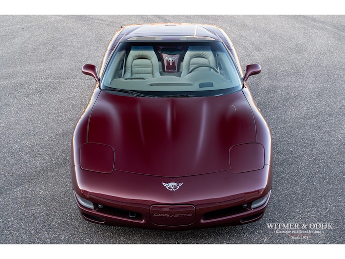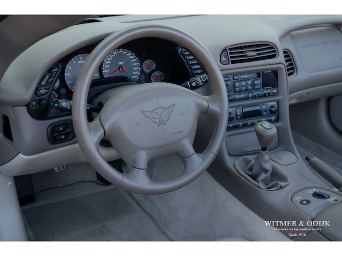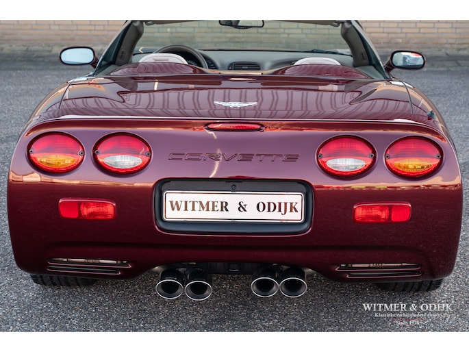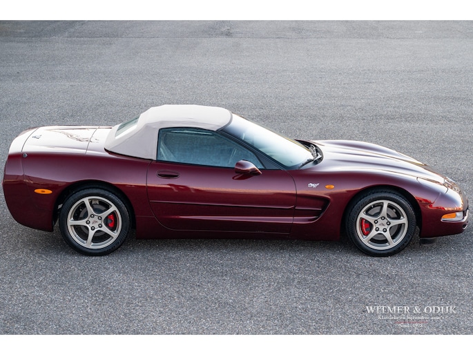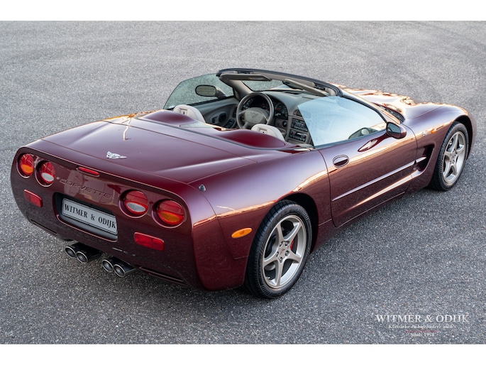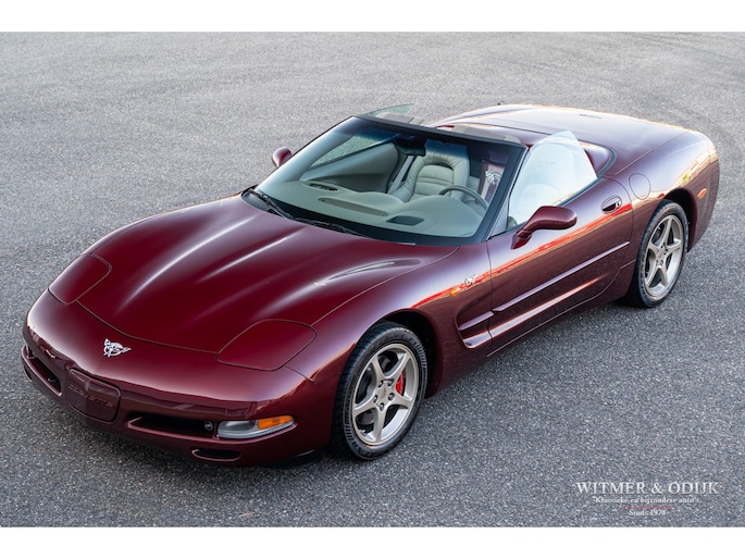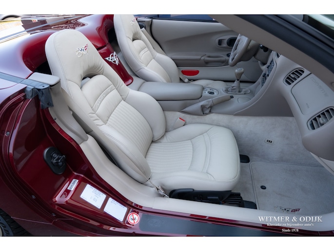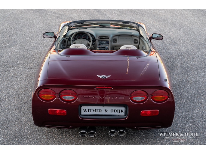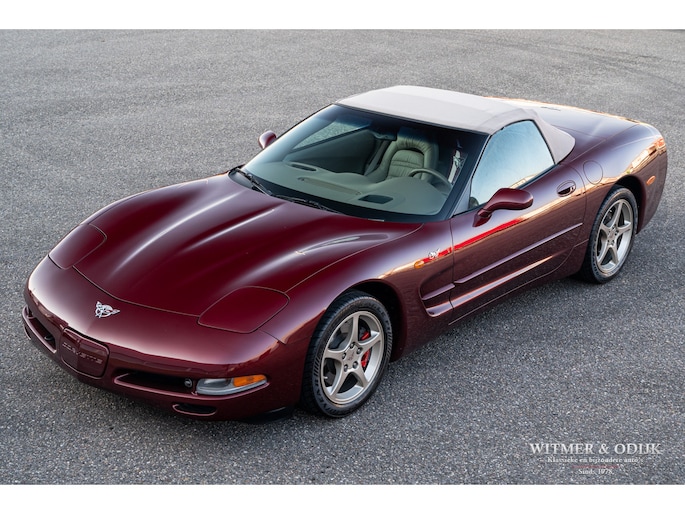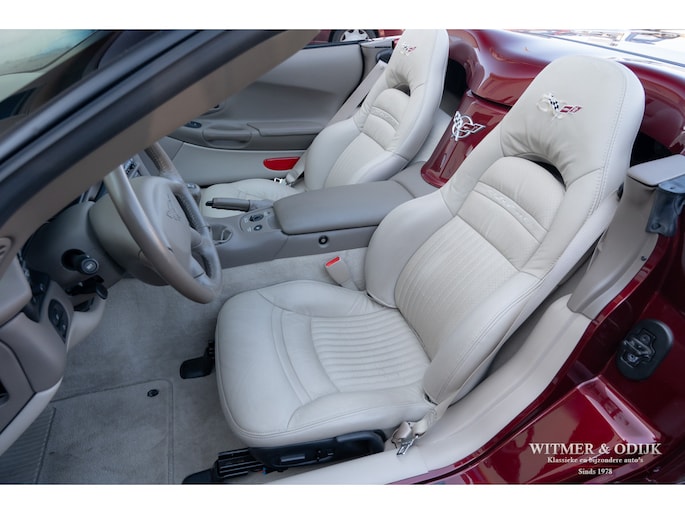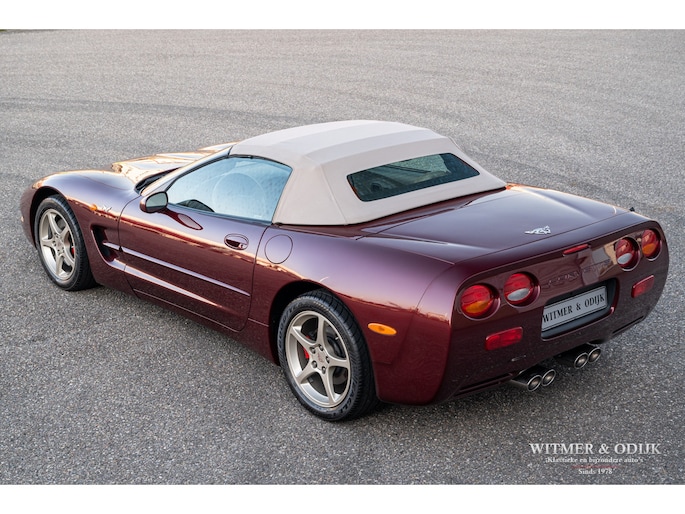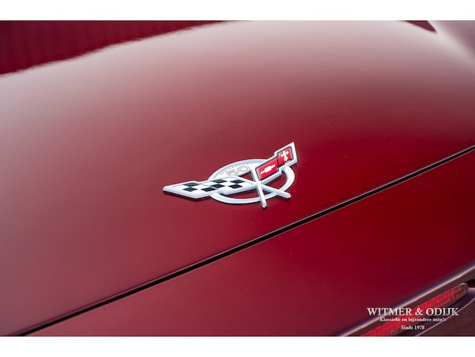 Bij het vijftig jarig bestaan van het merk Corvette in 2003 presenteerde General Motors de 50th Anniversary versie. Deze C5 werd geleverd in een speciaal voor de gelegenheid gemengde kleur die de veelzeggende naam Anniversary Red meekreeg. Het interieur was alleen leverbaar in een lichte tint die men Shale noemde. Verder werd de auto voorzien van 17 en 18 inch lichtmetalen velgen in Champagne metallic. Onder al deze uiterlijke kenmerken huisde de traditionele 5,7 liter V8 die 350pk naar de achterwielen bracht. Om dit vermogen nog beter te beteugelen kreeg de Corvette op deze 50th Anniversary versie het nieuwe Magnetic Selective Ride Control mee, adaptieve schokdempers die zich automatisch instellen op het wegdek en rijgedrag. Met het, zeker voor die tijd, enorme vermogen van 350pk en 360Nm koppel een fijn hulpmiddel om de Corvette optimaal te benutten. Door het verplaatsen van de versnellingsbak naar de achteras, voor het eerst op de C5 toegepast, verbeterde overigens het weggedrag al fors. De C5 werd een groot succes voor Corvette, de 50th Annivesary uitvoering werd in 2003 gelimiteerd op 11.632 stuks. Op een enkel exemplaar in een museum na is dit waarschijnlijk de C5 convertible met de laagste kilometerstand wereldwijd. Met slechts 1.815 kilometers op de teller is deze Corvette uiteraard als nieuw. Het betreft een origineel Europees uitgeleverde auto met de sportieve handbak met zes versnellingen. Alle originele boekjes en sleutels zijn uiteraard aanwezig. Goede wijn behoeft geen krans zegt men wel, deze Corvette C5 laat zich eenvoudig samenvattend beschrijven, als nieuw! Deze 50th Anniversary C5 is o.a. uitgerust met dual zone climat control, head-up display, cruise control, Delco audioinstallatie met Bose luidsprekers en subwoofer, boordcomputer, elektrische stoelverstelling, Magnetic Selective Ride Control, traction control, ABS, etc.