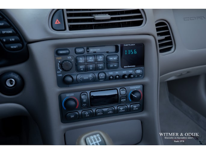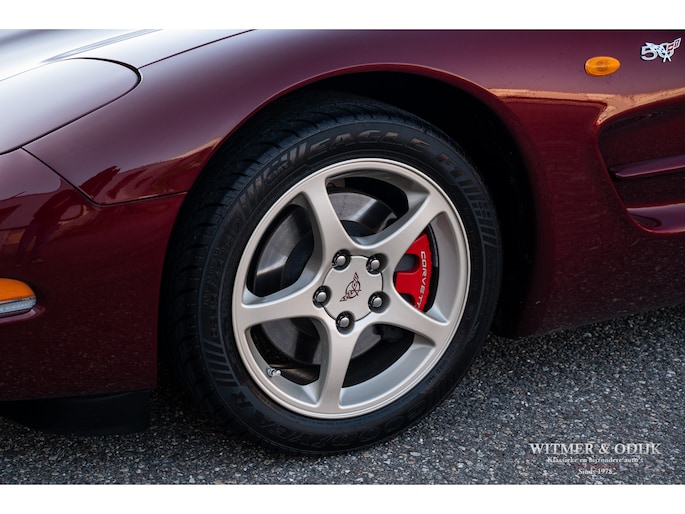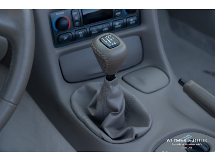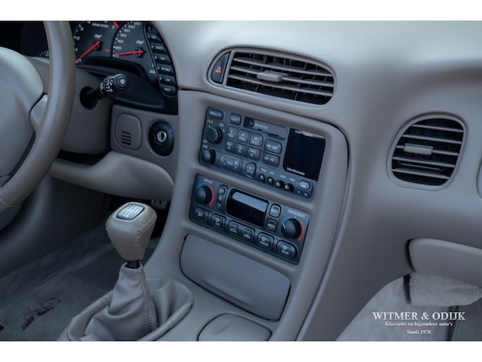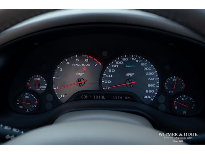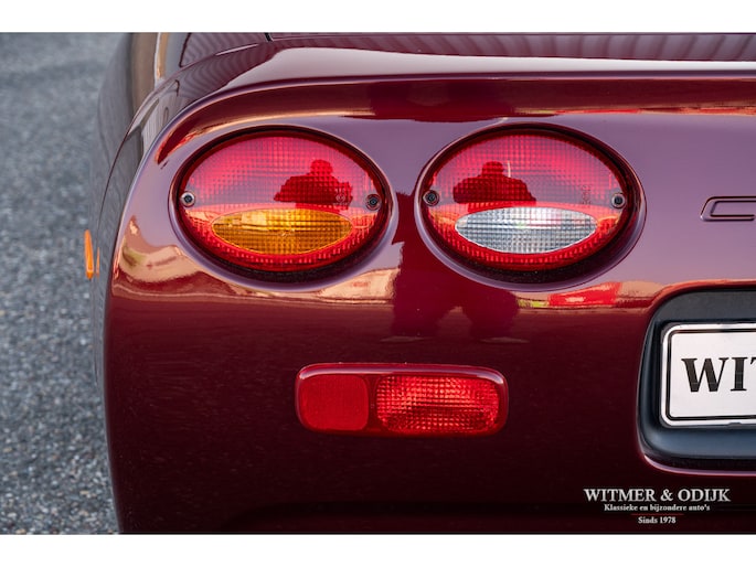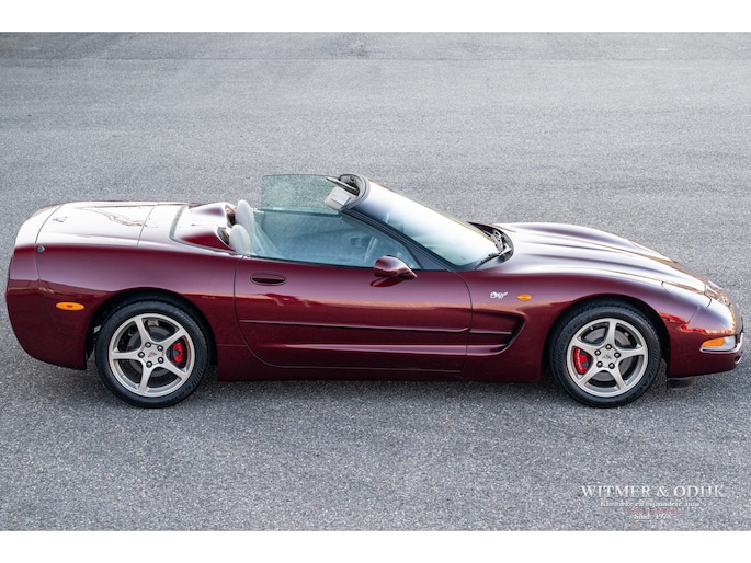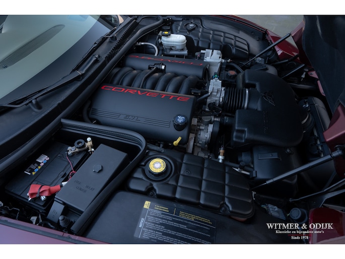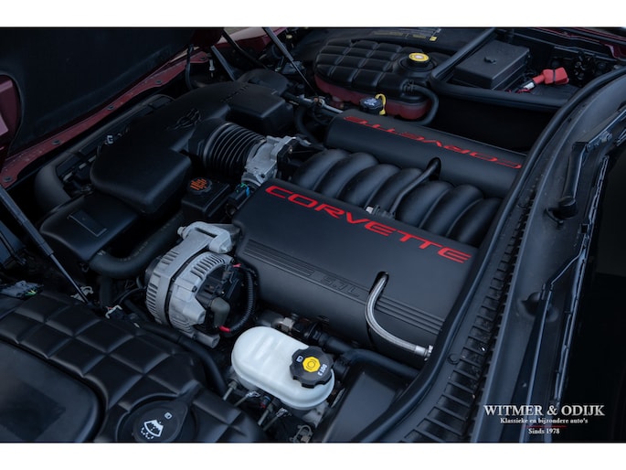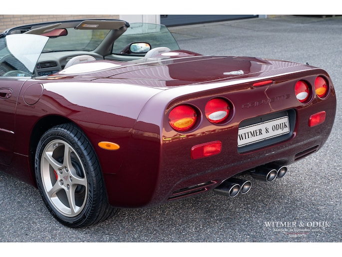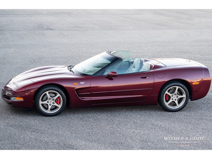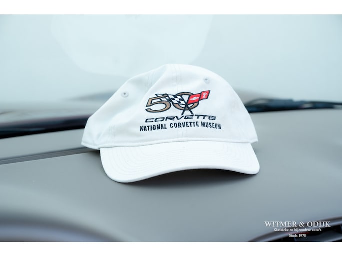 Bij het vijftig jarig bestaan van het merk Corvette in 2003 presenteerde General Motors de 50th Anniversary versie. Deze C5 werd geleverd in een speciaal voor de gelegenheid gemengde kleur die de veelzeggende naam Anniversary Red meekreeg. Het interieur was alleen leverbaar in een lichte tint die men Shale noemde. Verder werd de auto voorzien van 17 en 18 inch lichtmetalen velgen in Champagne metallic. Onder al deze uiterlijke kenmerken huisde de traditionele 5,7 liter V8 die 350pk naar de achterwielen bracht. Om dit vermogen nog beter te beteugelen kreeg de Corvette op deze 50th Anniversary versie het nieuwe Magnetic Selective Ride Control mee, adaptieve schokdempers die zich automatisch instellen op het wegdek en rijgedrag. Met het, zeker voor die tijd, enorme vermogen van 350pk en 360Nm koppel een fijn hulpmiddel om de Corvette optimaal te benutten. Door het verplaatsen van de versnellingsbak naar de achteras, voor het eerst op de C5 toegepast, verbeterde overigens het weggedrag al fors. De C5 werd een groot succes voor Corvette, de 50th Annivesary uitvoering werd in 2003 gelimiteerd op 11.632 stuks. Op een enkel exemplaar in een museum na is dit waarschijnlijk de C5 convertible met de laagste kilometerstand wereldwijd. Met slechts 1.815 kilometers op de teller is deze Corvette uiteraard als nieuw. Het betreft een origineel Europees uitgeleverde auto met de sportieve handbak met zes versnellingen. Alle originele boekjes en sleutels zijn uiteraard aanwezig. Goede wijn behoeft geen krans zegt men wel, deze Corvette C5 laat zich eenvoudig samenvattend beschrijven, als nieuw! Deze 50th Anniversary C5 is o.a. uitgerust met dual zone climat control, head-up display, cruise control, Delco audioinstallatie met Bose luidsprekers en subwoofer, boordcomputer, elektrische stoelverstelling, Magnetic Selective Ride Control, traction control, ABS, etc.
