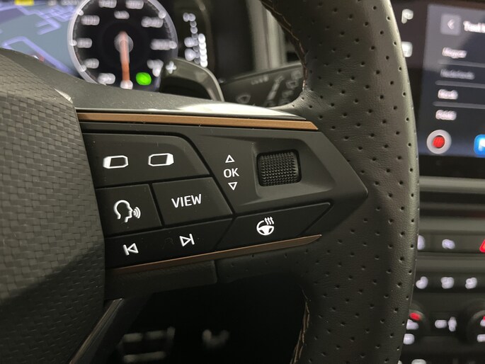 De achteruitrijcamera vergemakkelijkt achteruit inparkeren. Je ziet duidelijk wat er achter de auto gebeurt. De auto is voorzien van een trekhaak en is een uitstekende caravantrekker. Kies de muziek waarvan jij houdt, dankzij de DAB-radio klinkt het altijd geweldig. Intussen bedien je het audio-installatiesysteem en het navigatiesysteem met de knoppen op het stuur of met je stem. Bij de luxe van deze auto hoort ook automatische airconditioning. Deze Cupra is voorzien van regensensor, cruise control, buitentemperatuurmeter, automatisch dimmende binnenspiegel, isofix-aansluiting en centrale deurvergrendeling met afstandsbediening.