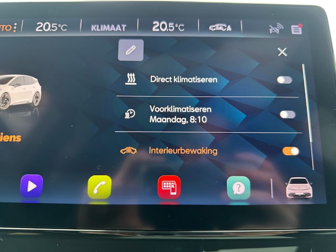 Voor het overzicht tijdens iedere rit is deze CUPRA Born voorzien van een gemakkelijk afleesbaar digitaal dashboard. De 360 graden camera op deze auto wordt verzorgd door vier geavanceerde camera's. Het biedt garantie van uitstekende beeldkwaliteit. Adaptive cruise control houdt de ingestelde snelheid vast en houdt afstand tot het voertuig voor u. Uw smartphone is tegenwoordig de sleutel tot heel veel. Ook voor deze auto. Remote services, noemen we dat. Waar u ook bent, contact houden is een eitje. Hoog, laag, midrange: het high performance audiosysteem is volledig afgestemd op de akoestiek in deze auto. Ook dashboard met spraakbediening, full map navigatiesysteem, achteropkomend verkeer waarschuwing, automatische airconditioning, draadloos opladen en DAB ontvangst horen tot de voorzieningen op deze auto.