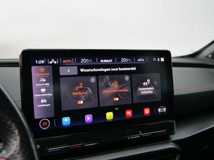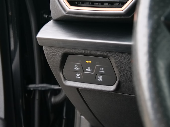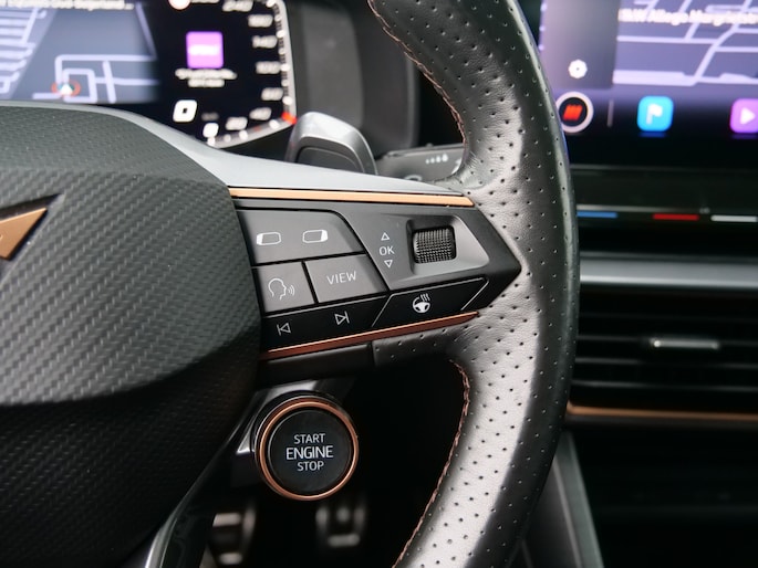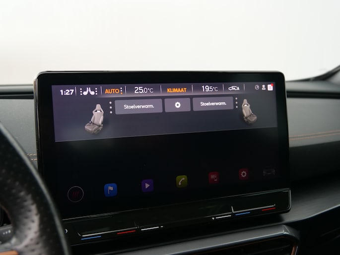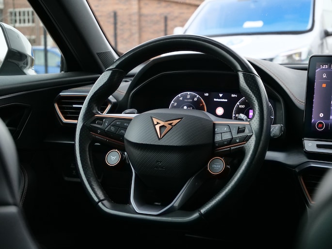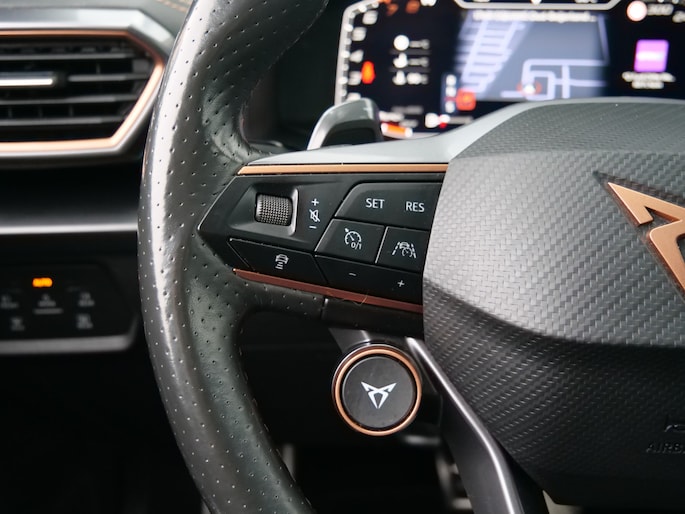 Zoals u mag verwachten van deze CUPRA Formentor is hij uitgerust met een reeks aan actieve veiligheidssystemen. Dat de auto steeds meer taken van de bestuurder overneemt, merkt u bijvoorbeeld aan het systeem voor verkeersbord-detectie in deze auto. Indien u onbedoeld de rijstrook lijkt te verlaten, reageert het Lane-keeping systeem meteen en corrigeert. Veel aanrijdingen bestaan uit kop-staartbotsingen. De forward collision warning reduceert dat risico aanzienlijk. Bovenop deze veiligheidsfeatures heeft deze CUPRA bovendien dodehoekdetectie, hill hold functie, vermoeidheidsherkenning, autonoom remsysteem en bandenspanningcontrolesysteem.