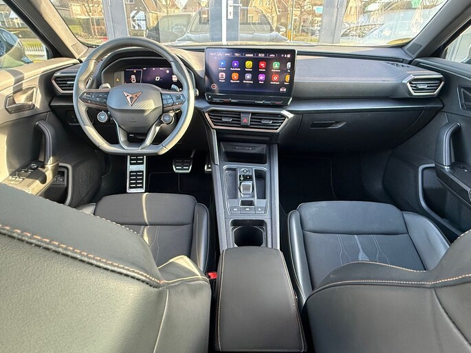 U ziet het al aan de buitenkant en u voelt het zodra u de krachtige motor start, deze sportieve Cupra Formentor is gemaakt om prestaties te leveren. De aandrijving van deze Cupra wordt verzorgd door een viercilinder motor en een automatische transmissie. Doe maar luxe! Neem plaats in de verwarmbare voorstoelen en voel de weldaad in koude dagen. Sportief rijden stelt eisen aan een stevige zitpositie voor rijder en bijrijder. Vandaar de strakke sportstoelen! Als u blij wordt van licht en ruimte dan zult u zeker genieten van het elektrisch bediende panoramadak. Een handige voorziening op deze auto is de elektrische achterklep die u op afstand kunt openen. Geen gekleum meer in de koude dagen. Het verwarmd stuurwiel voelt als een weldaad na het ijskrabben. Bij de uitrusting van deze Cupra horen onder meer LED-dagrijverlichting, extra getint glas, in delen neerklapbare achterbank, LED-achterlichten, verstelbare lendensteunen en snelheidsafhankelijke stuurbekrachtiging.